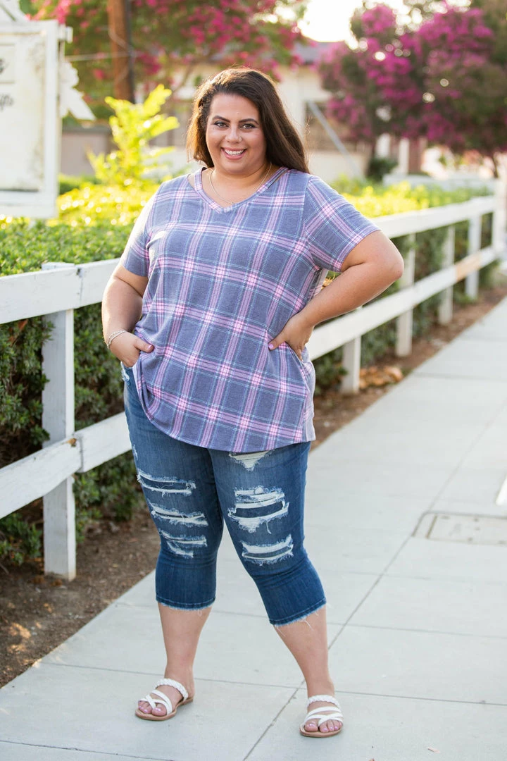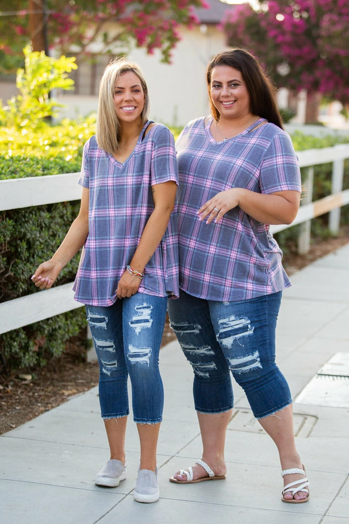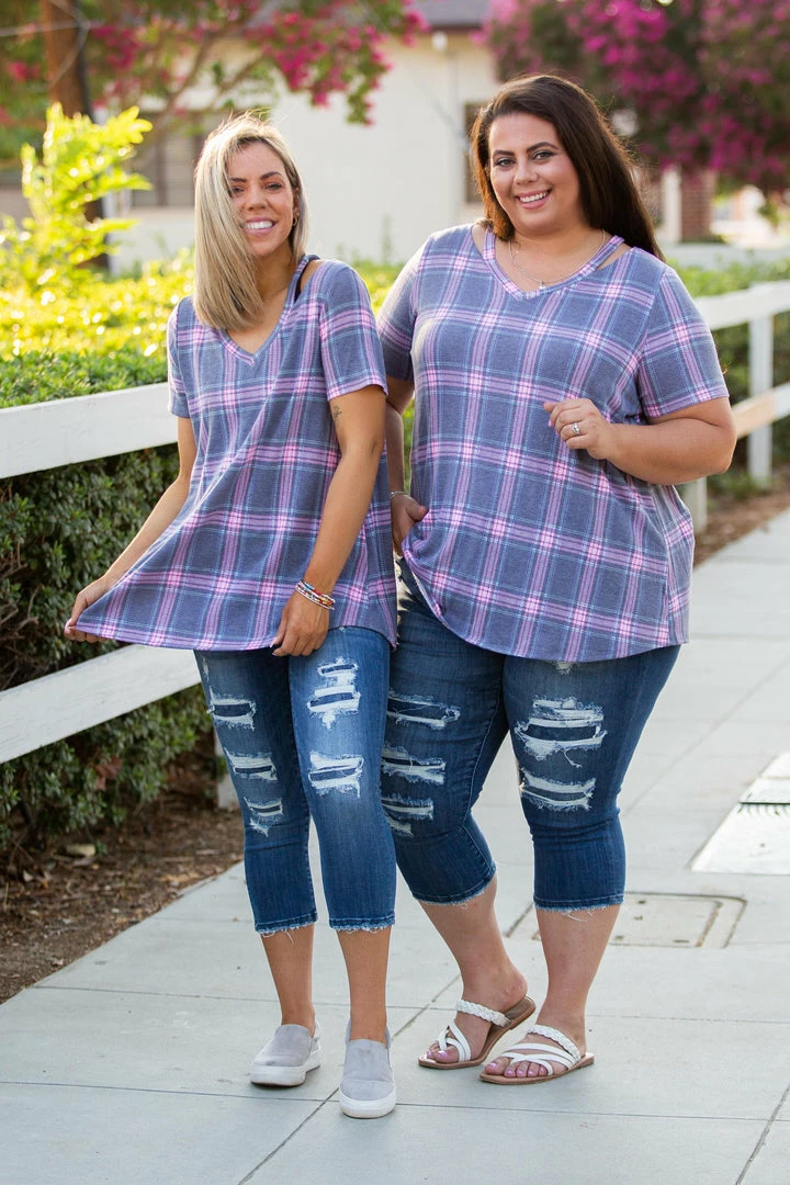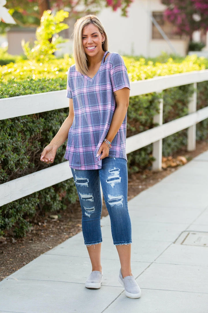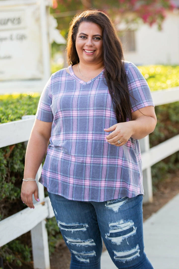 Made from the softest jersey material this plaid top is ready to take you anywhere. The pinks, purples and teals that make this plaid against that charcoal background is the perfect color recipe for your wardrobe. With a relaxed fit, this top features short sleeves, v-neck with small shoulder cutouts and a rounded hem.