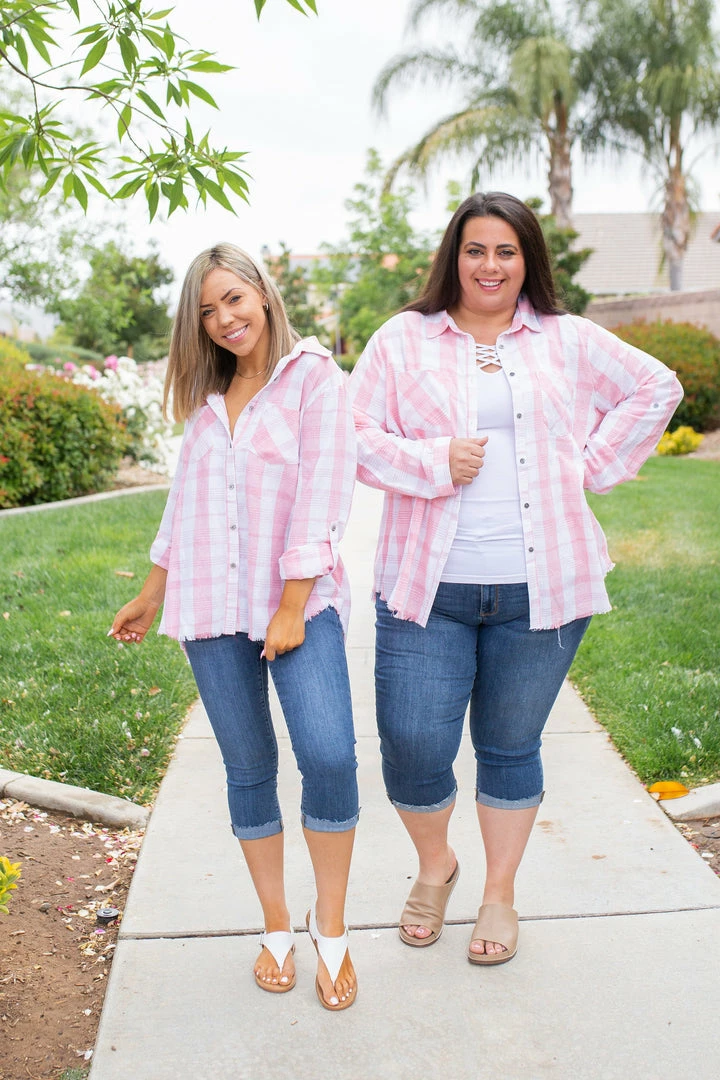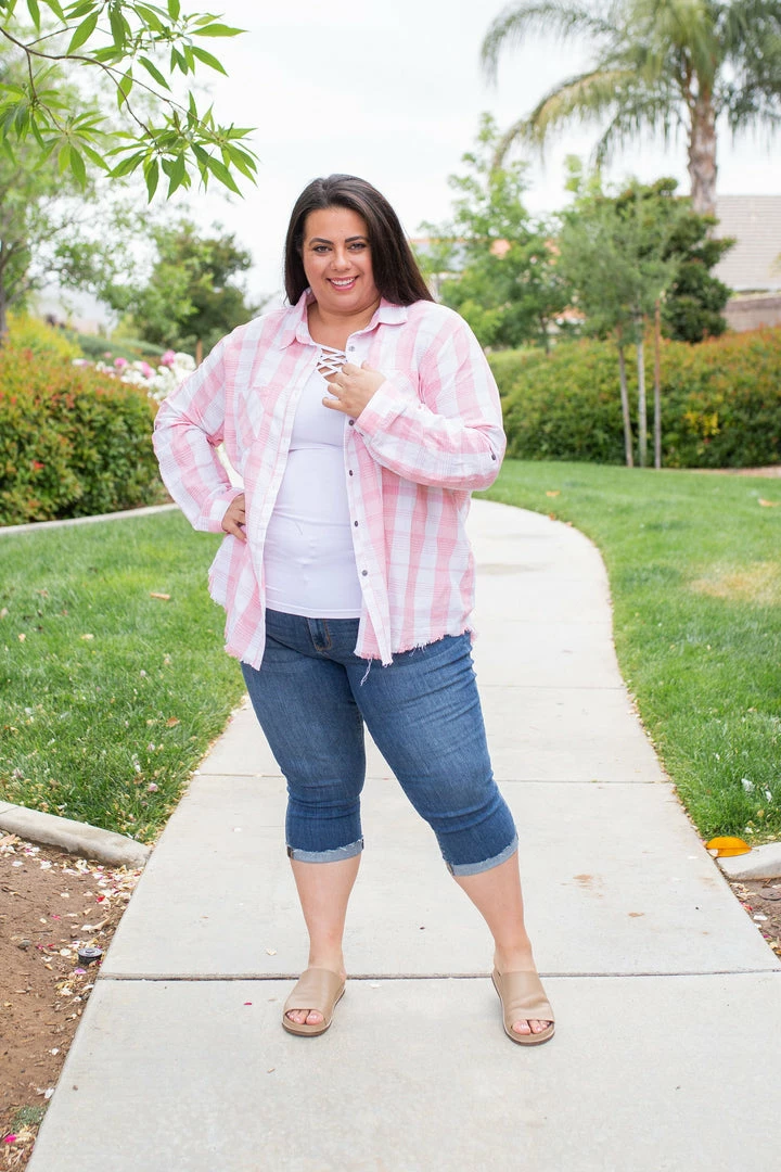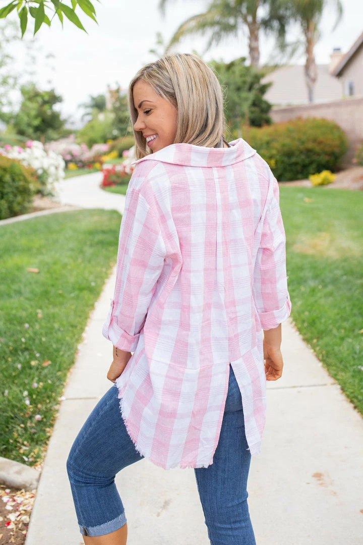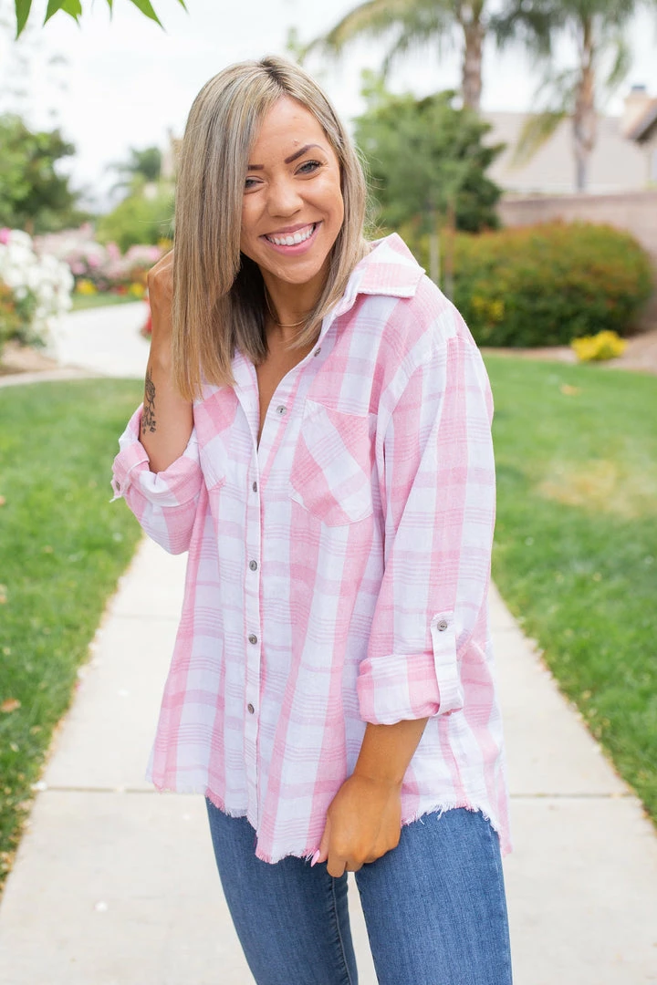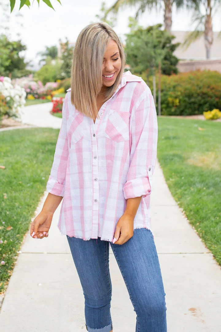 Take me to the fair, because this is what I want to wear while eating cotton candy and listening to music. Wear this top buttoned up, or open over your favorite cami. With a relaxed fit, this top features a collar, front pockets, long sleeves with a button closure to make it a 3/4 sleeve and a frayed hem.