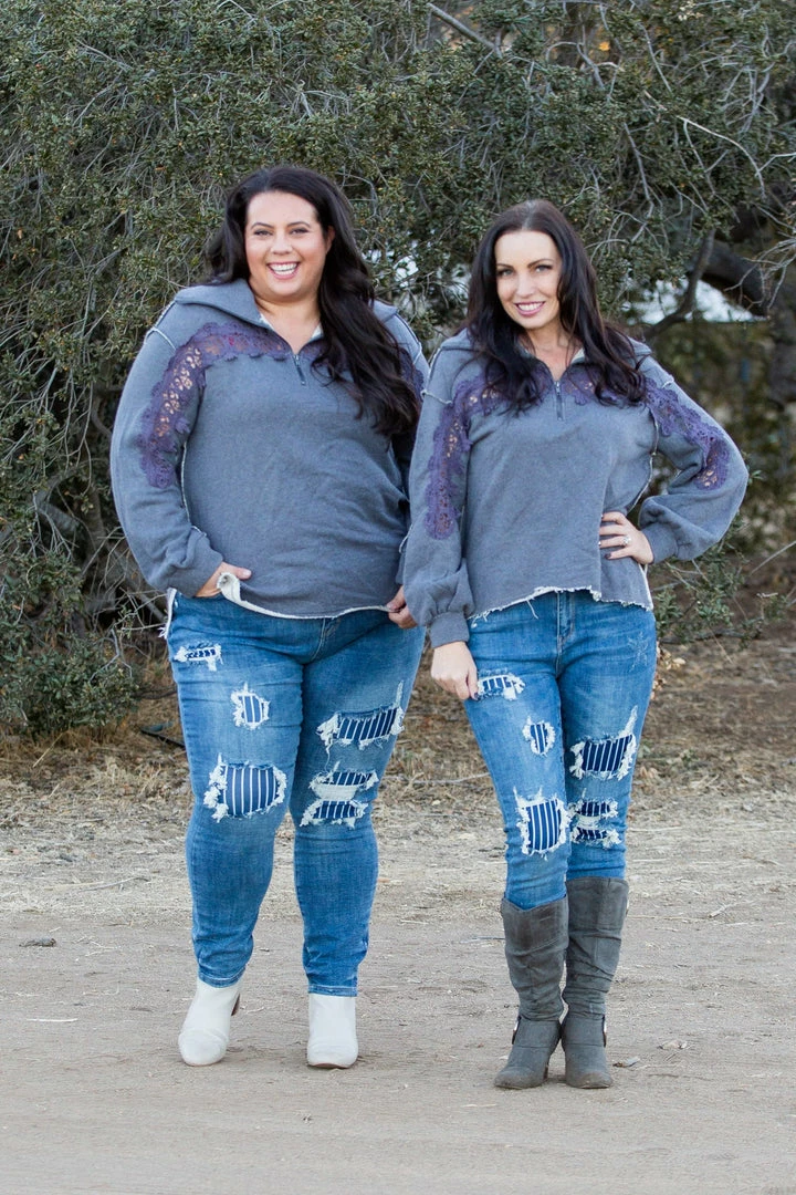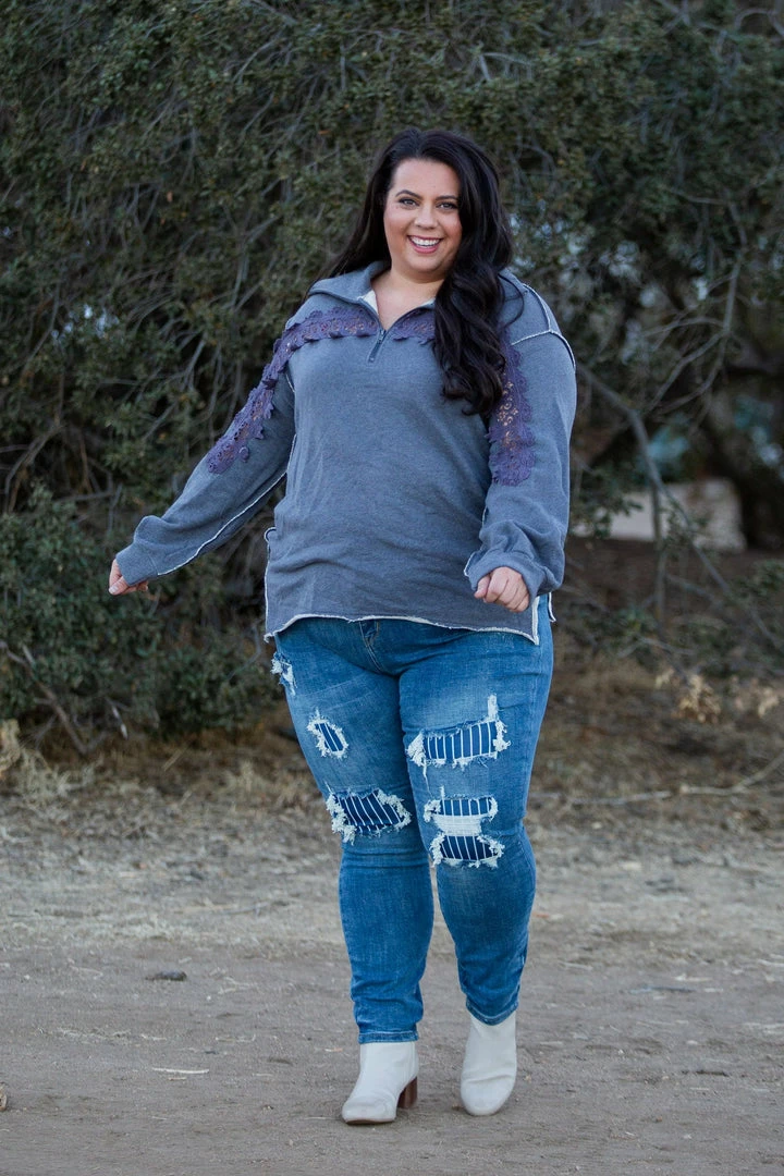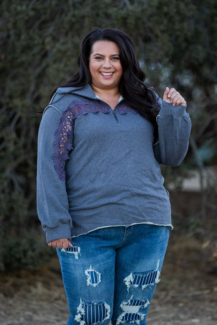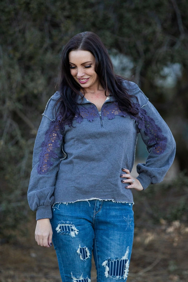 This french terry pullover is one of our absolute favorites. We love the turtleneck that can be worn up or down with the zipper detail, the front lace crochet across the chest and down the arms, the side slits, we can go on and on. This one is an absolute must have!