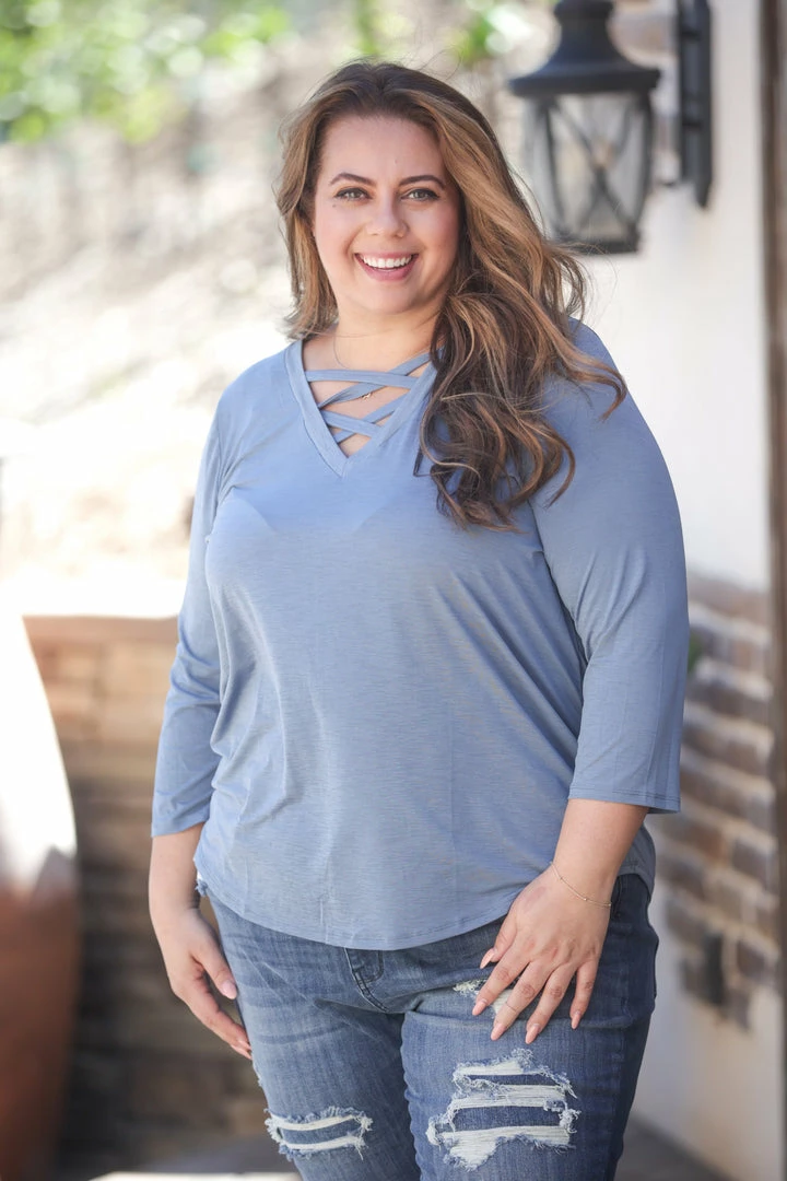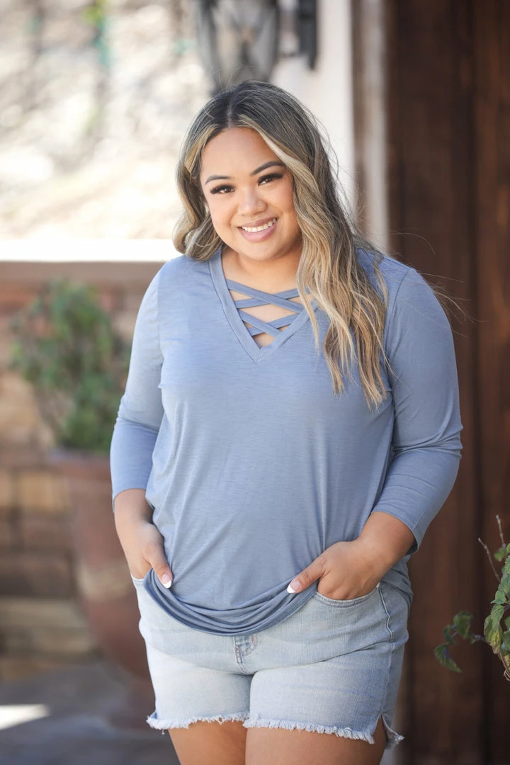 Made from amazing bulgari fabric, this slate blue top will become your next favorite. With a relaxed fit, this top features a v-neck with criss cross details, 3/4 sleeves and hi lo hem.
