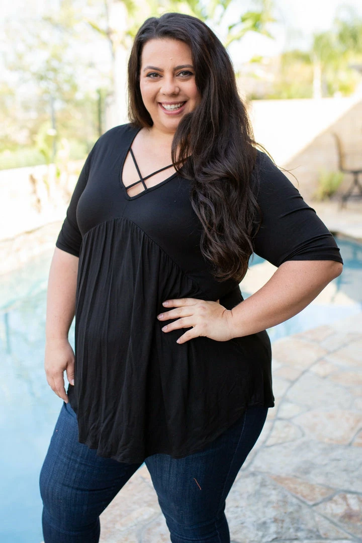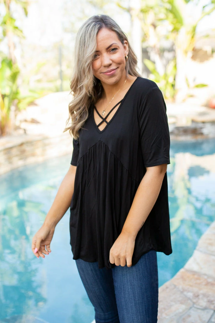 Meet any crossroad in life head on with this gorgeous and unique babydoll top. With a relaxed fit, this top features half sleeves, v-neck with criss cross details and an empire waist.