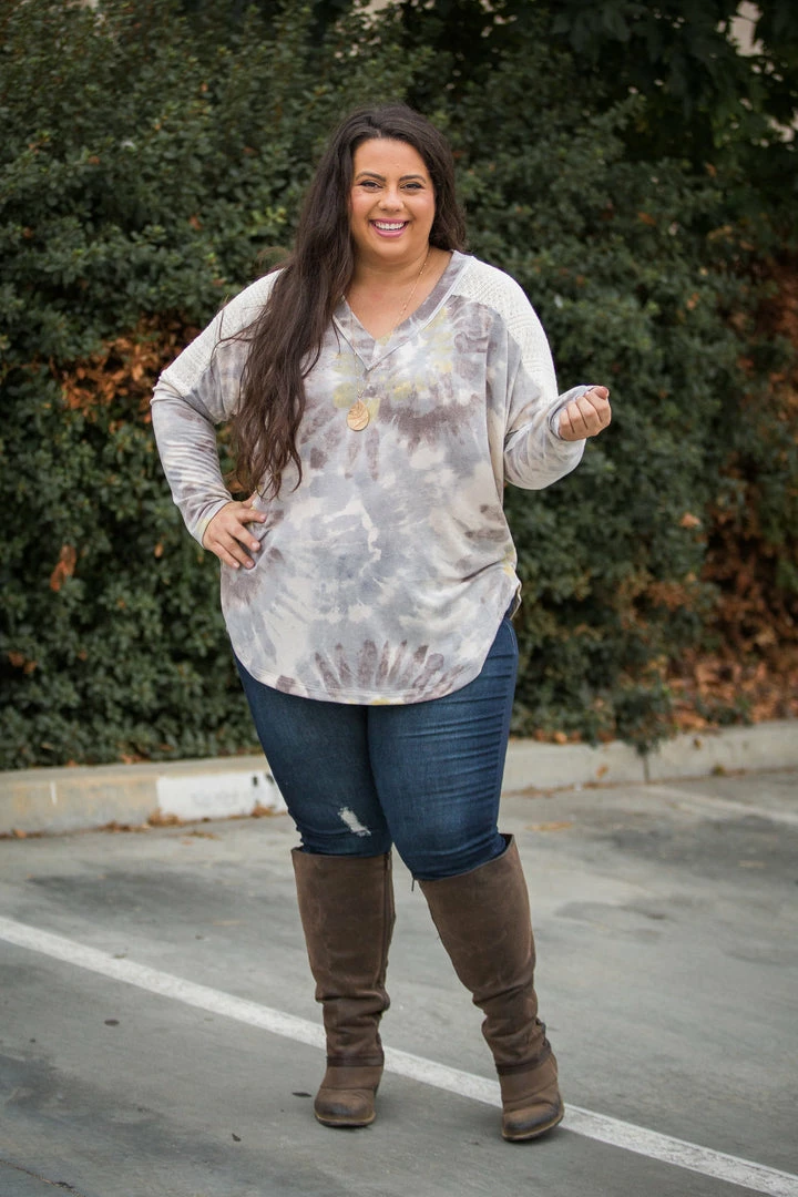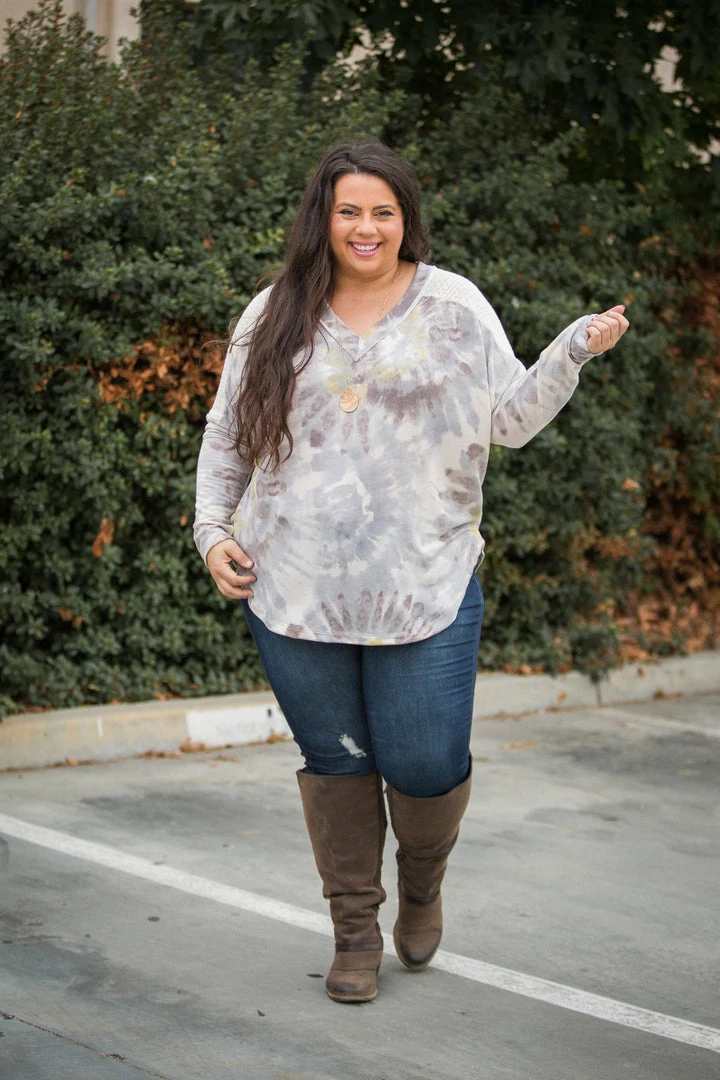 This long sleeve, v-neck top gives such a dainty look with the solid knit fabric on the shoulders and back panel. Not only is this top incredibly soft, but it also has a relaxed fit, raw edging detail and a rounded shirttail hem.