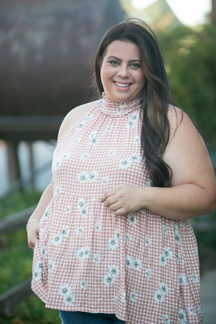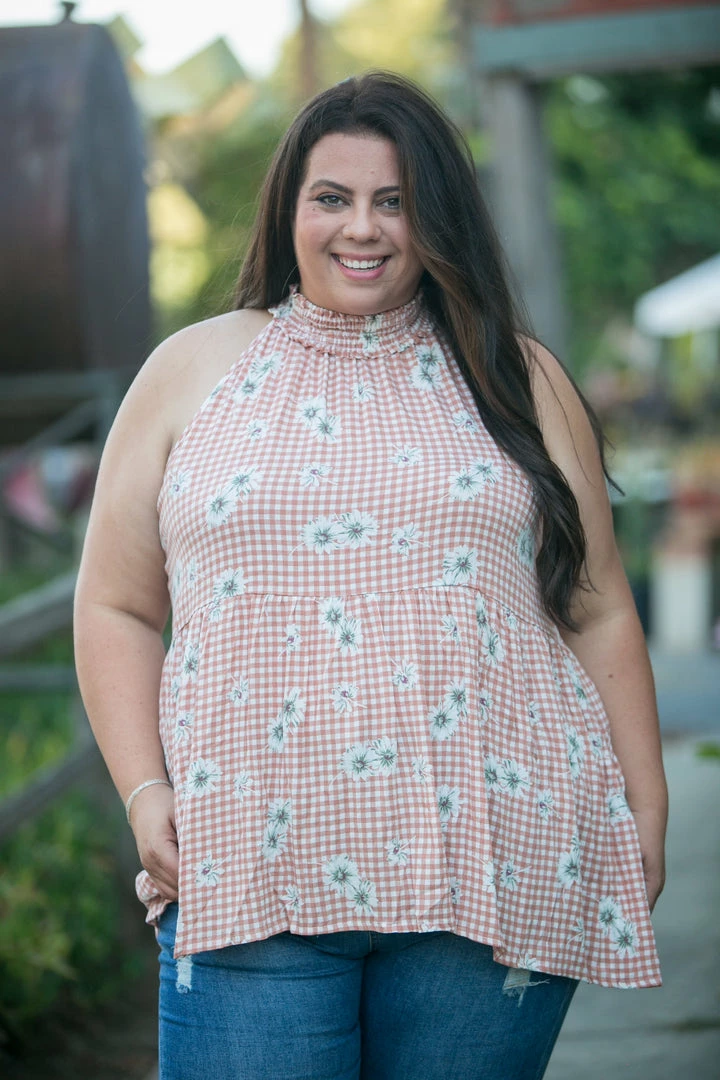Oh wow! This babydoll is such a perfect transitional piece that you can wear year round. The rust colored gingham brings such a warm feeling to this daisy printed top. With a relaxed fit, this sleeveless babydoll features a smocked mock neck with a back buttoned closure and hi lo hem.