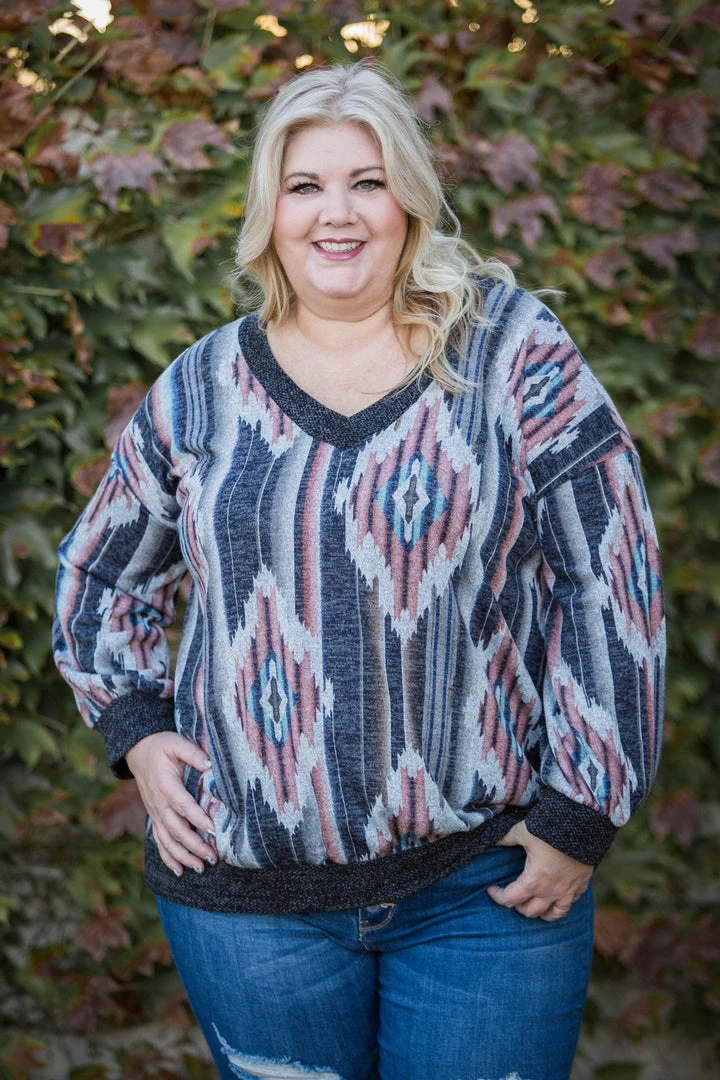This pullover breathes so much life into us. The neutral fall tones that cascade into each other to make this amazing aztec print is so soul soothing. The hem, cuffs and neckline are made from a thick, super soft sweater material that is sure to keep you warm and the bodice is made from a soft hacci.