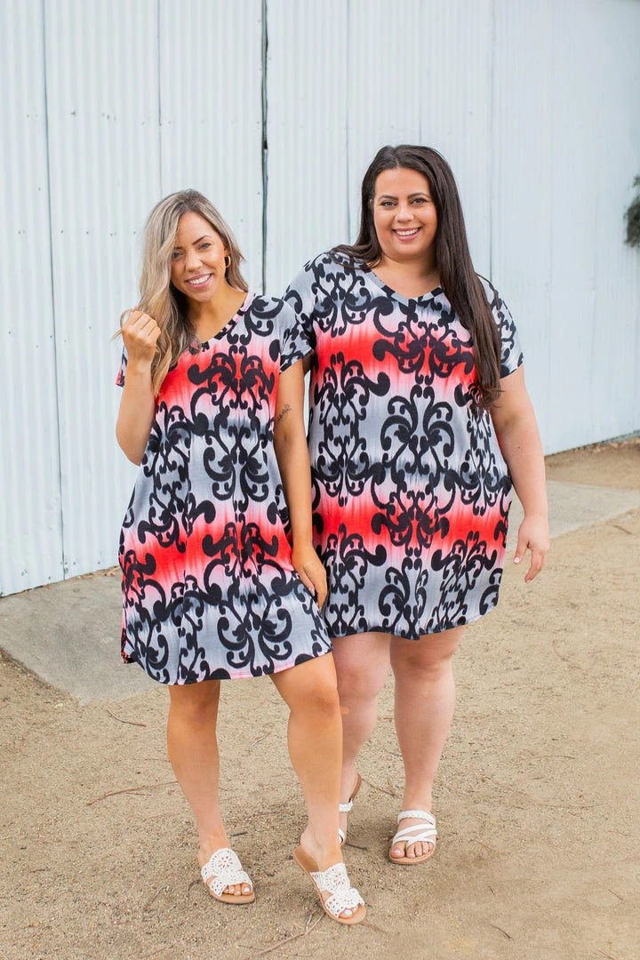 We are loving the vibrant colors in this damask short sleeve dress. The reds, blacks and greys really make for a fun color scheme. With a relaxed fit, this dress features a v-neck, rounded hem and pockets.