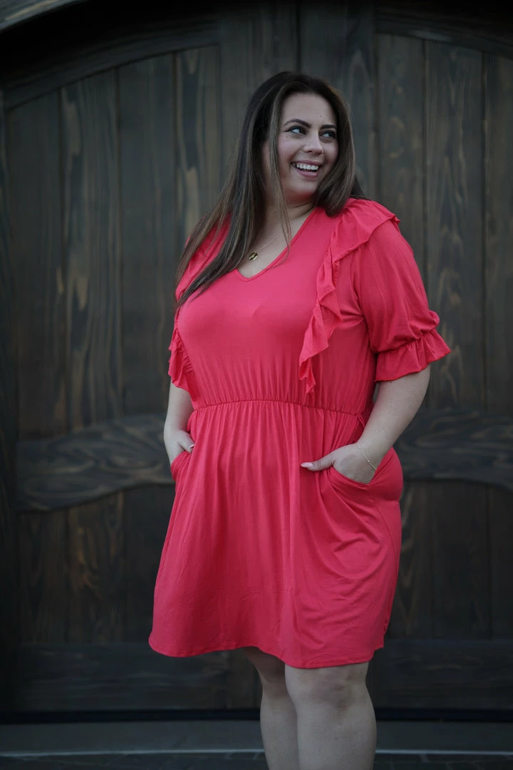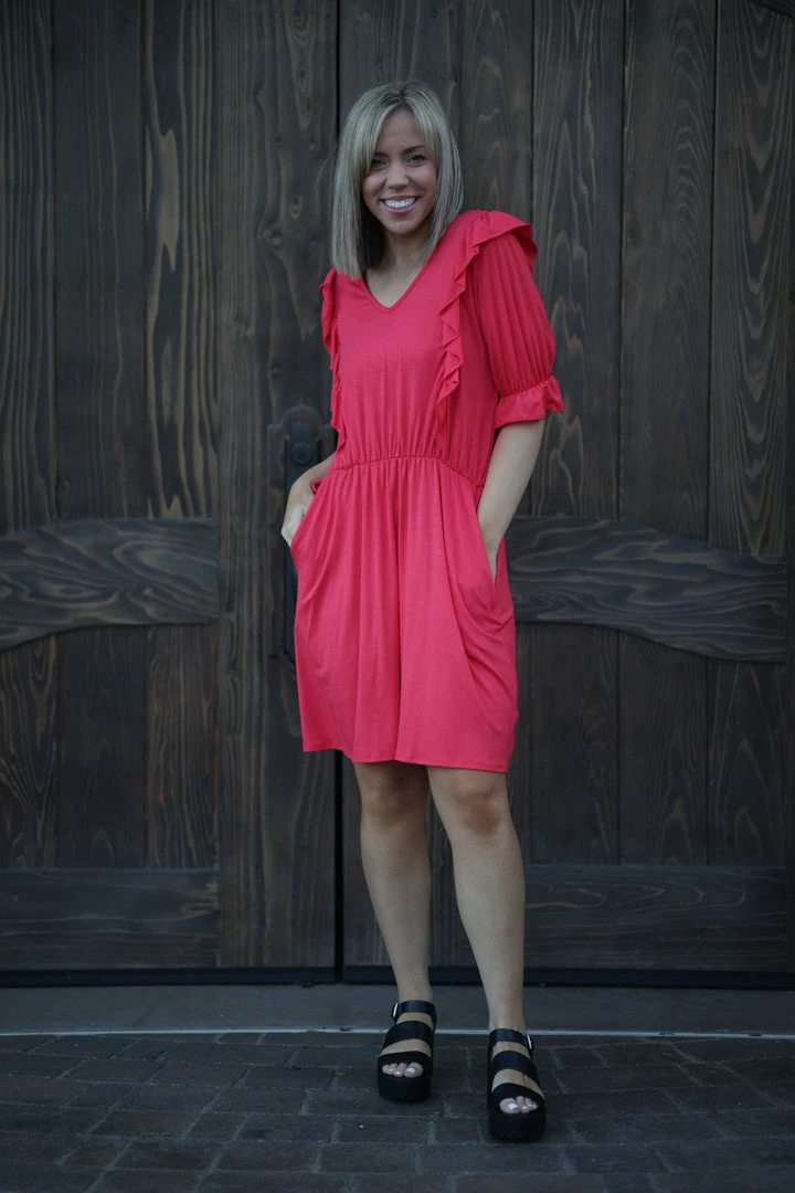 The definition of excellence is found right here in this stunning dress. With a relaxed fit, this top features a v-neck, ruffle details, short ruffle sleeves, pockets and belt loops so that you can easily add your favorite belt to dress this beauty up.