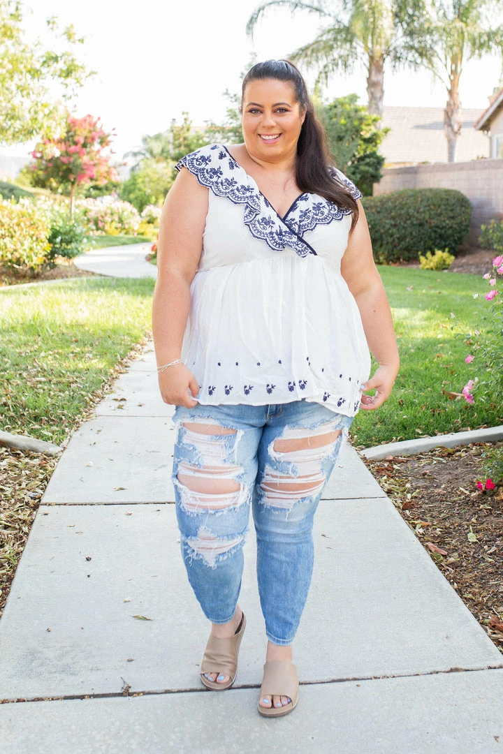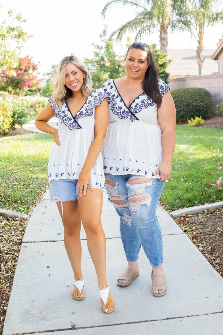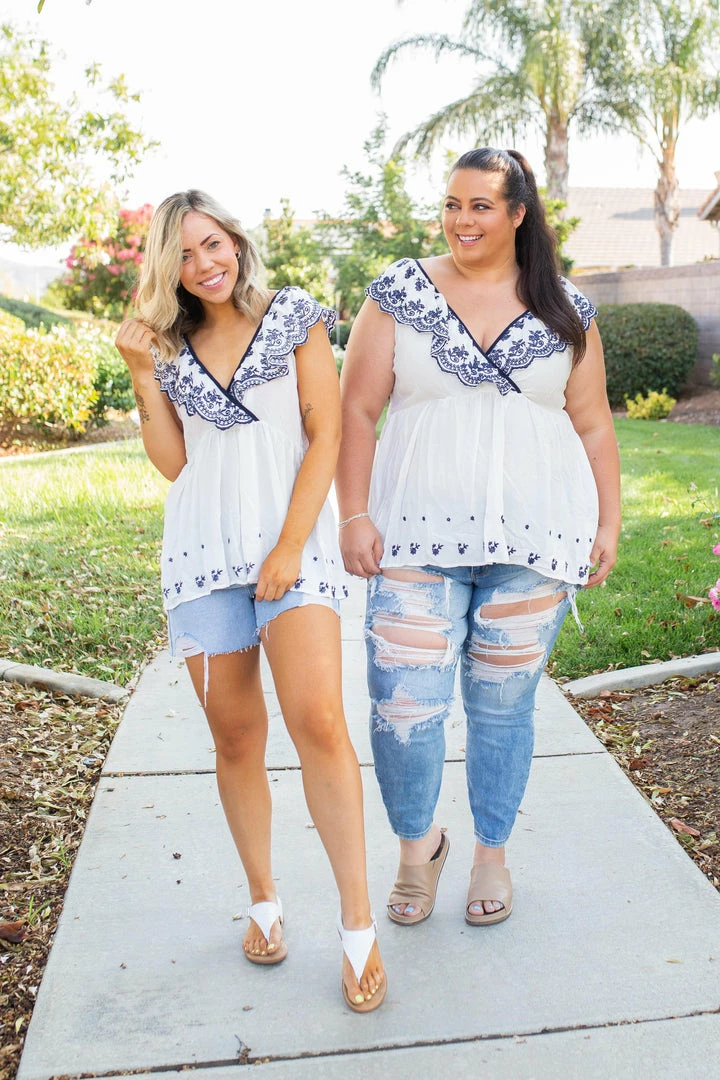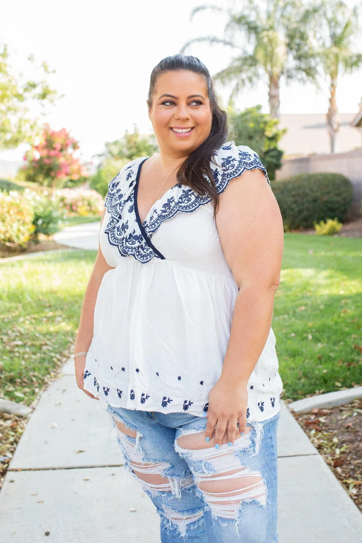 It doesn’t get any better than this stunning embroidered top. With a relaxed babydoll fit, this top features an embroidered ruffled surplice and self tie back.   Â