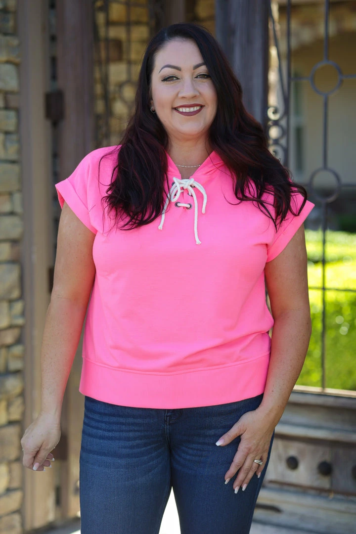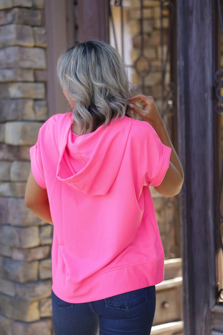 No one will ever be able to forget you in this vibrant hot pink short sleeve hoodie. SO perfect to welcome that warm weather in. Made from a soft terry fabric, this hoodie features, a v-neck with shoelace details, short cuffed sleeves, hood and rounded hem.