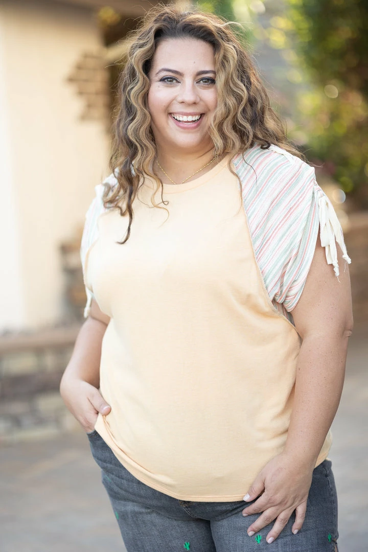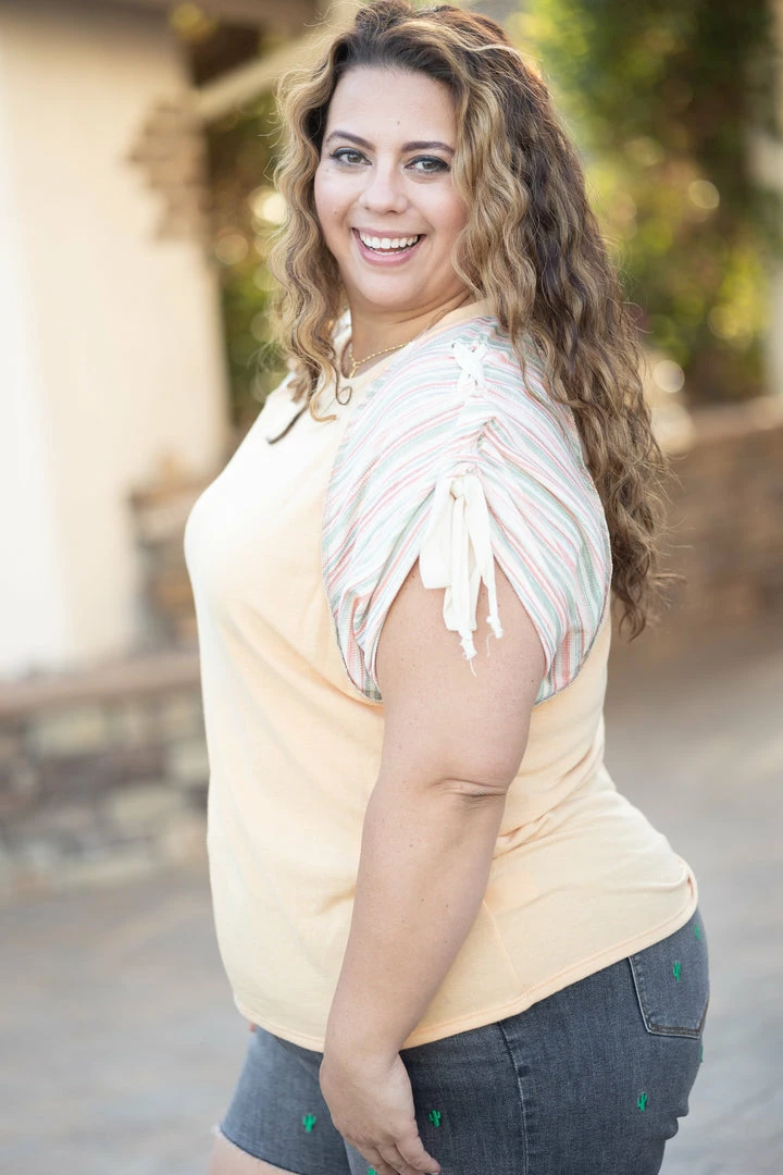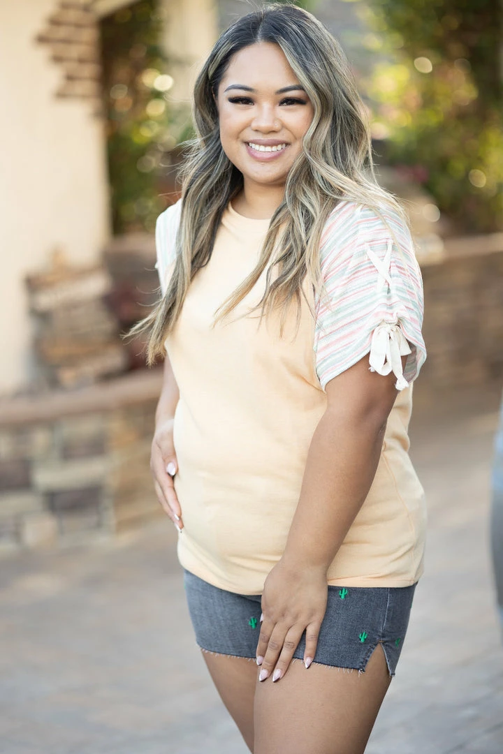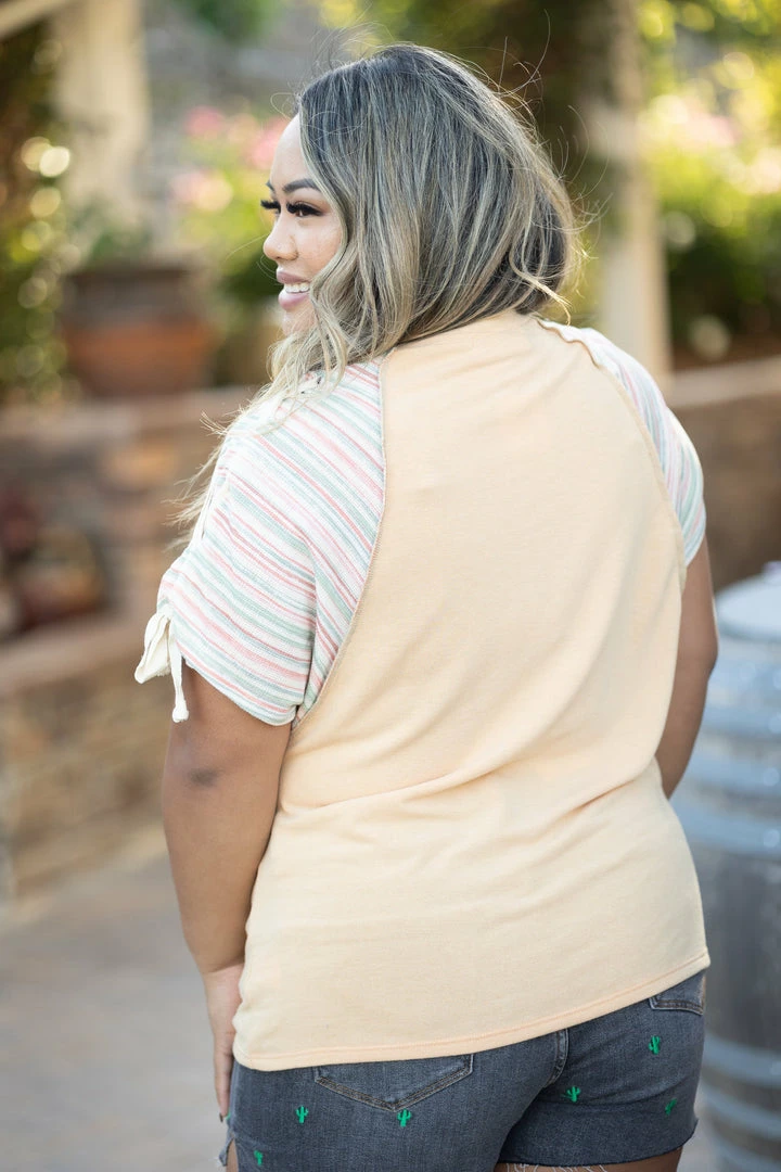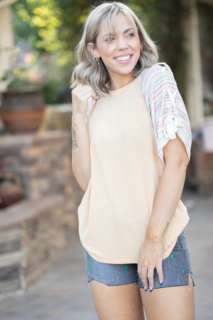 You can only move forward when wearing this super fun short sleeve raglan top. With an oversized fit, this top features a round neckline, short raglan sleeves with reverse stitching details and ties.