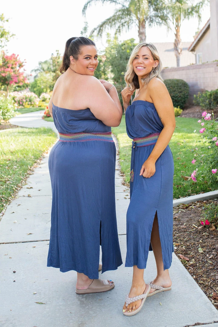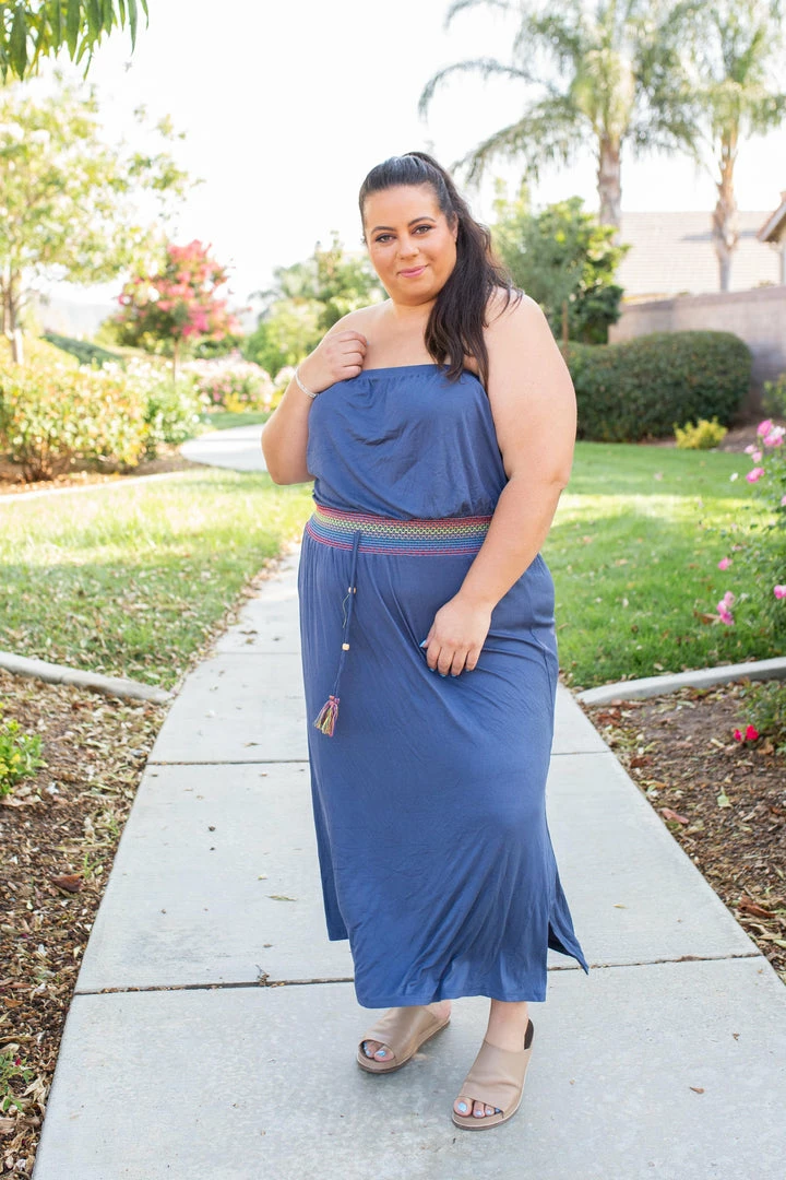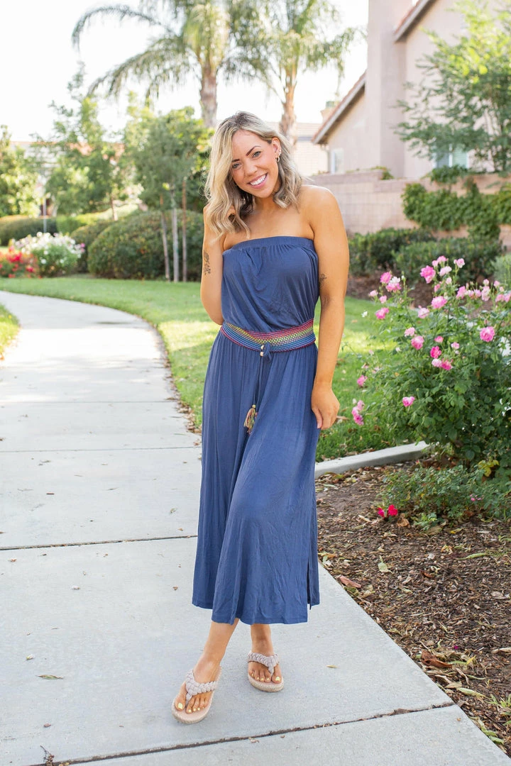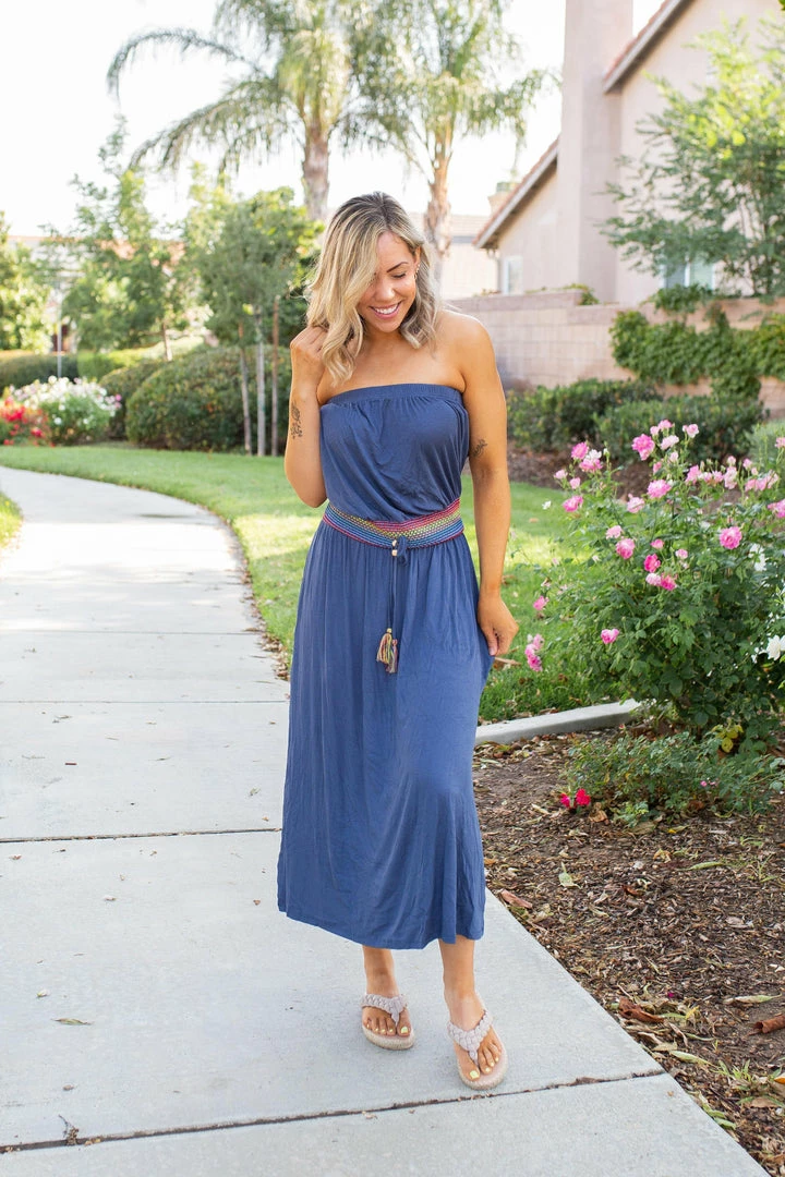 Make all your dreams come true in this navy off the shoulder maxi dress. We LOVE the rainbow elastic waist belt and tassels, which really make this dress one of a kind.