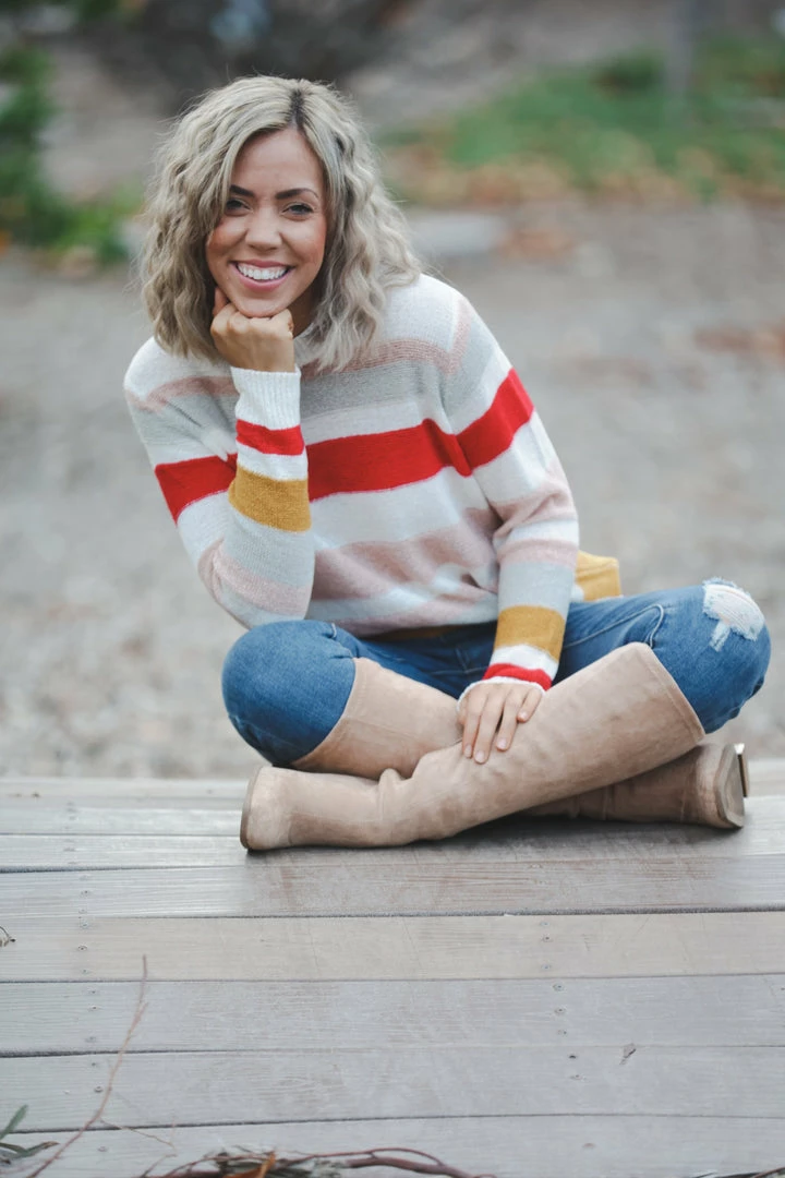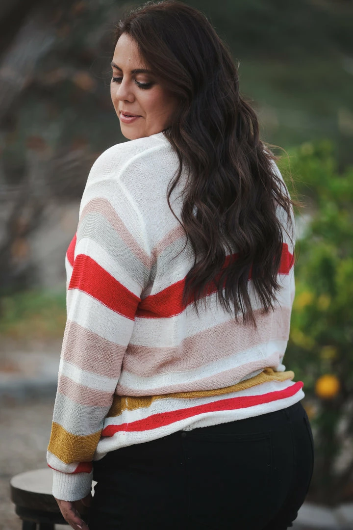 This long sleeve striped pullover is made from the softest loose knit, making it the best transitional pullover of all time. Those vibrant red, mauve and yellow stripes paired with the ivory and grey make for an array of amazing spring colors. With a relaxed fit, this pullover features a round neckline, cuffed sleeves and rounded hem.