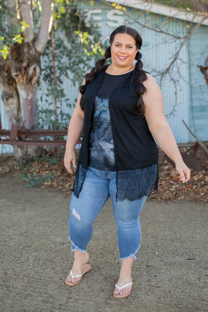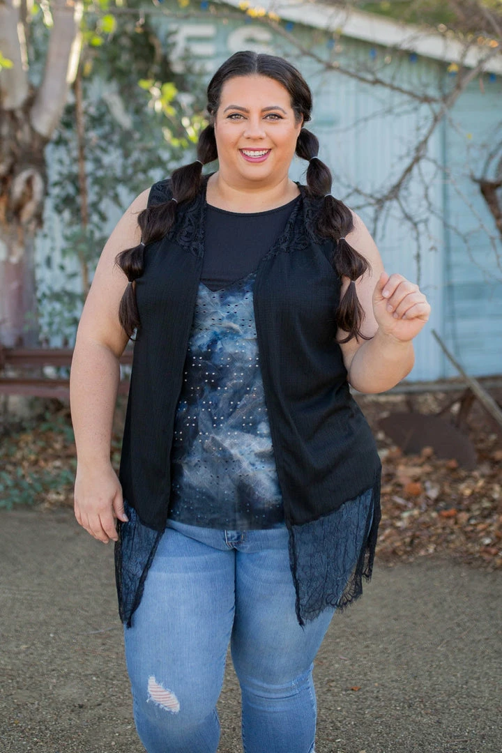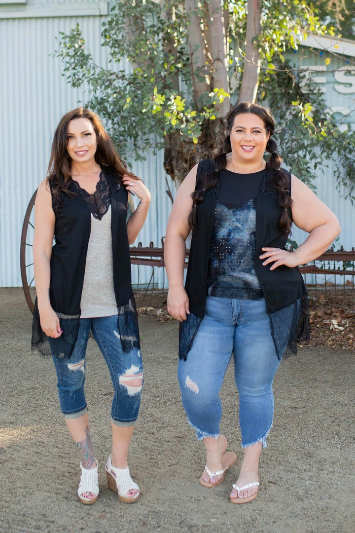 This long sleeveless vest is the perfect addition to add some layers to wardrobe during those warmer months. We are loving the lace details through the shoulders, back panel and hem.
