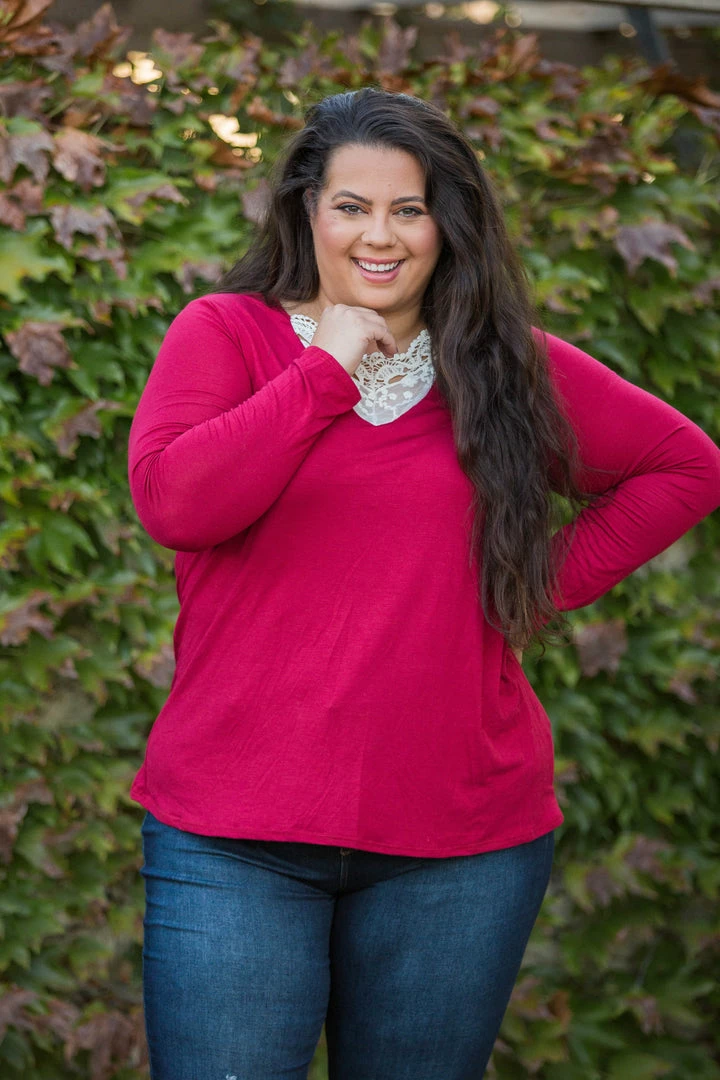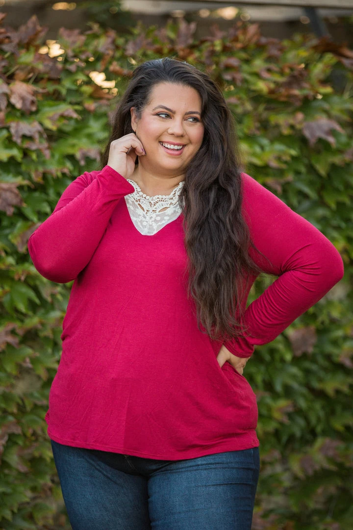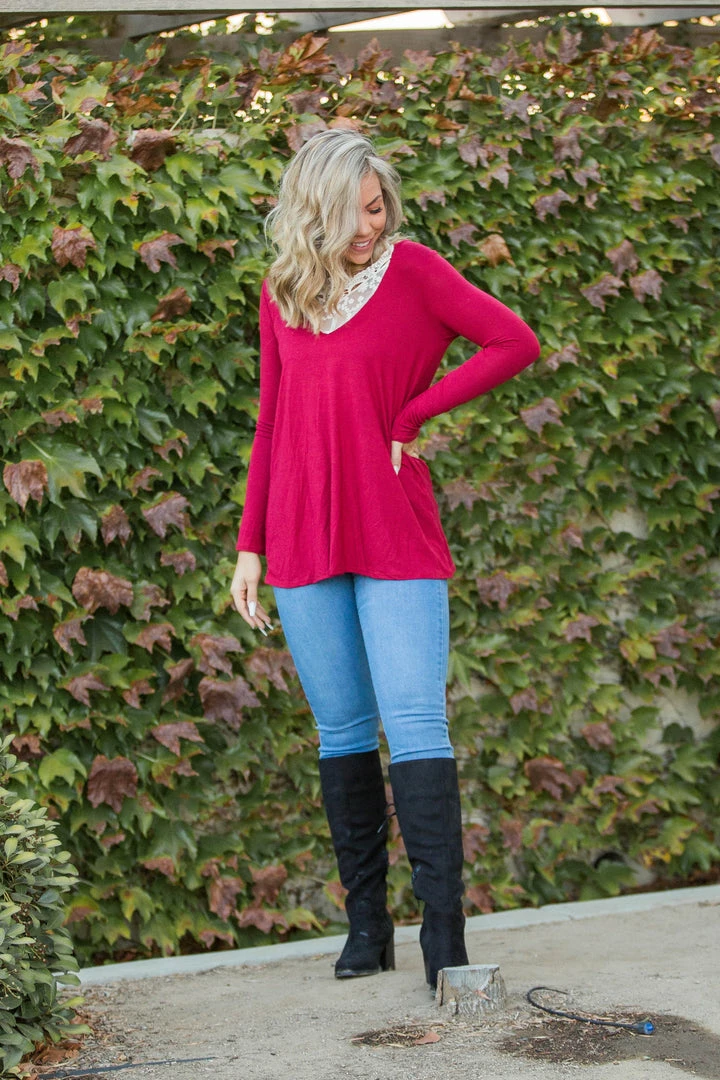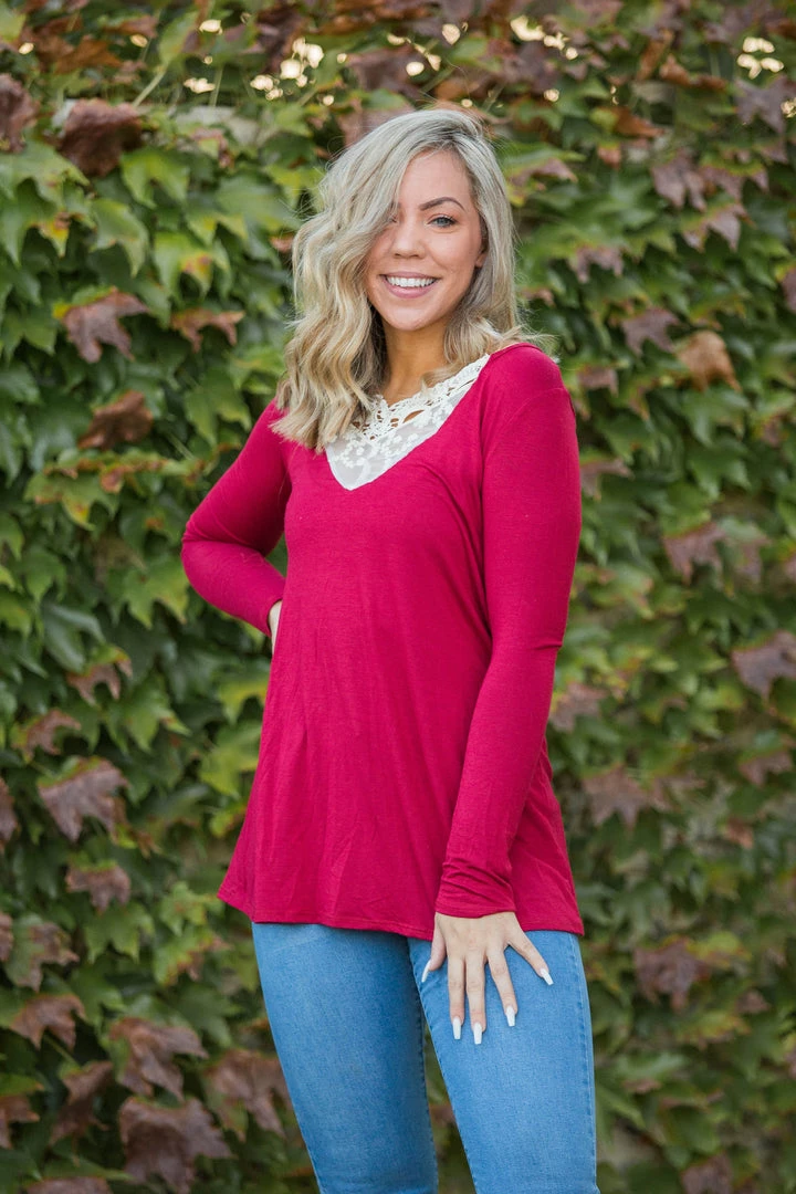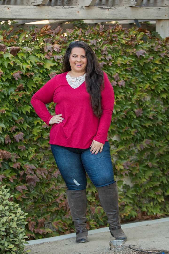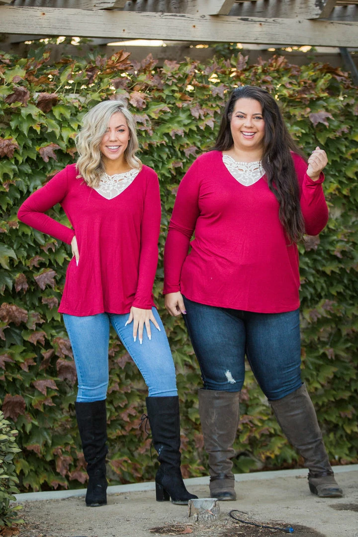 You are going to fall head over heels for this gorgeous red long sleeve top. This top also features a v-neck with lace insert and a relaxed fit.