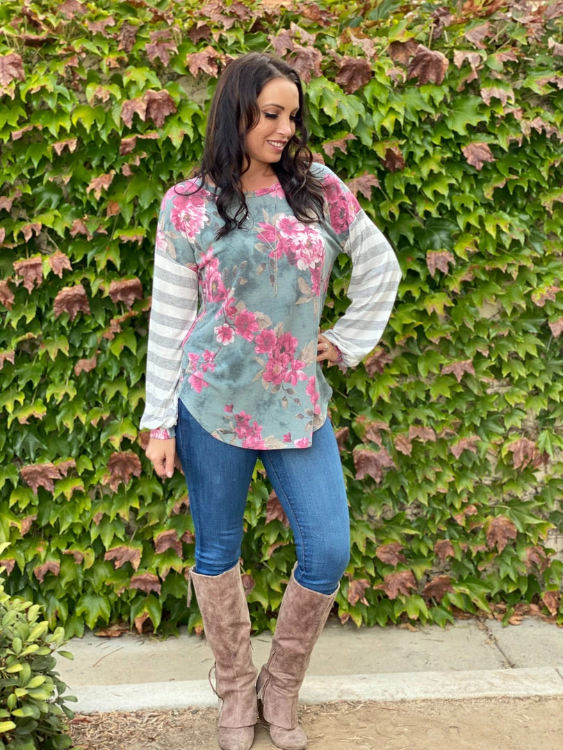 The sage and magenta colorway in this gorgeous floral printed top is to die for. Featuring long balloon sleeves, a round neckline and a relaxed fit.