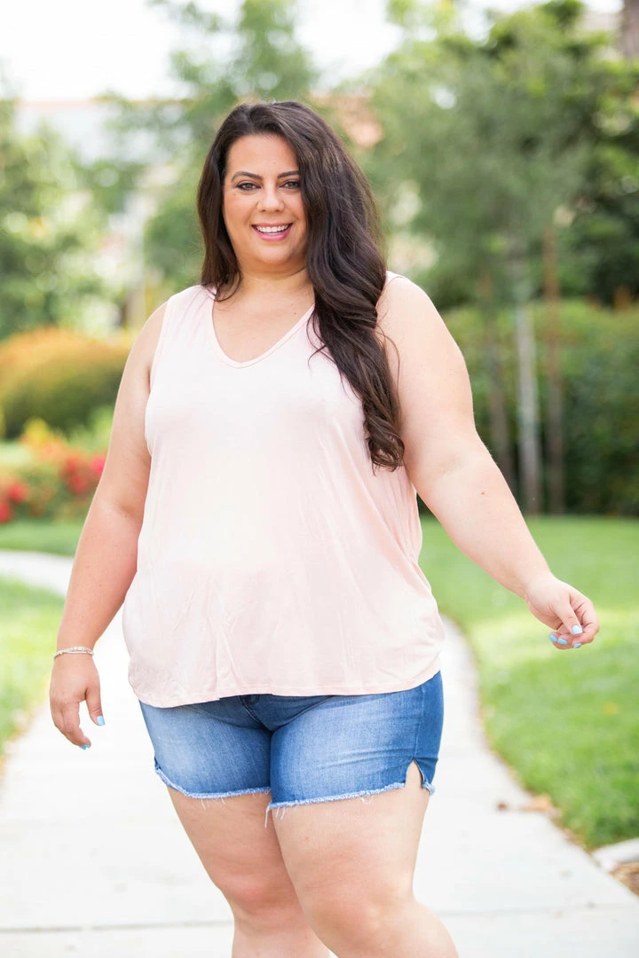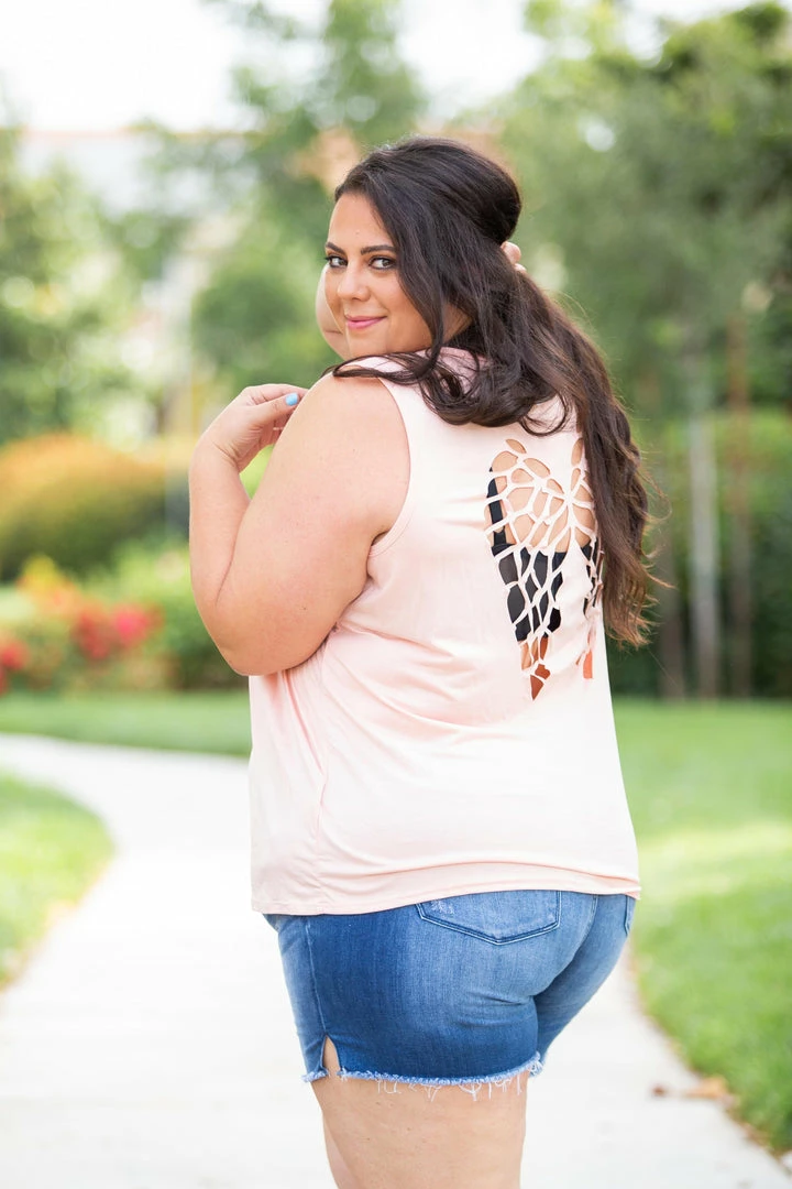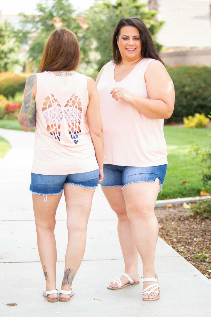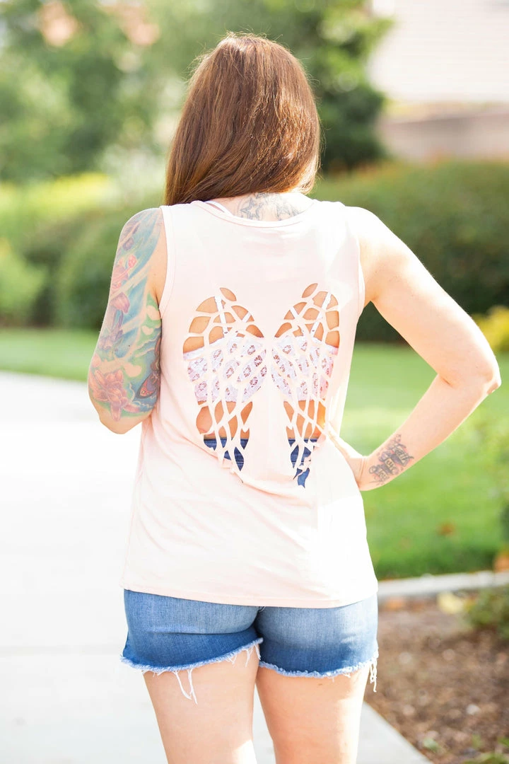 Let your angelic side shine through in this stunning baby pink laser cut sleeveless top. Pair this top with your favorite bralette for a complete look. Made from a soft jersey knit, this top has the most amazing laser cut angel wings on the back and also features a v-neck and relaxed fit.