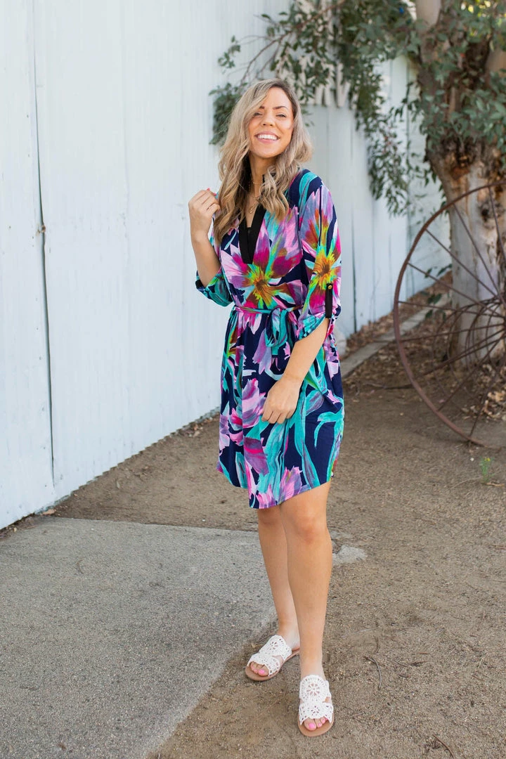 Exotic meets sophistication with this 3/4 sleeve dress. Made from bulgari fabric, this dress features 3/4 roll up button sleeves, a mandarin collar and waist belt detail. You can wear this beauty on it’s own or over a pair of leggings.