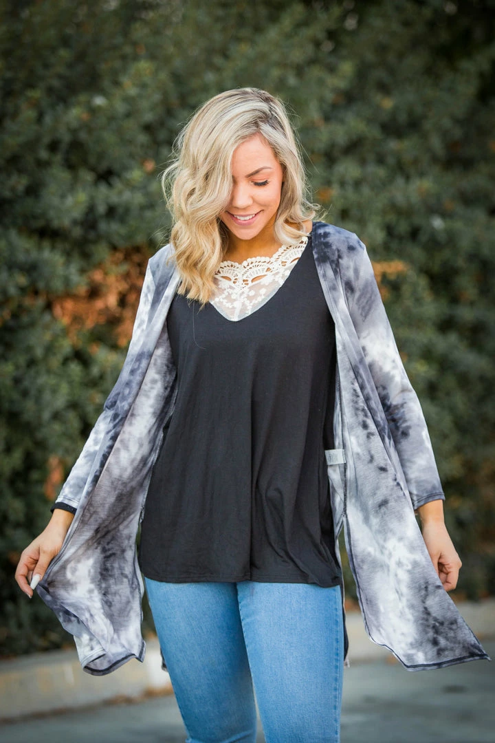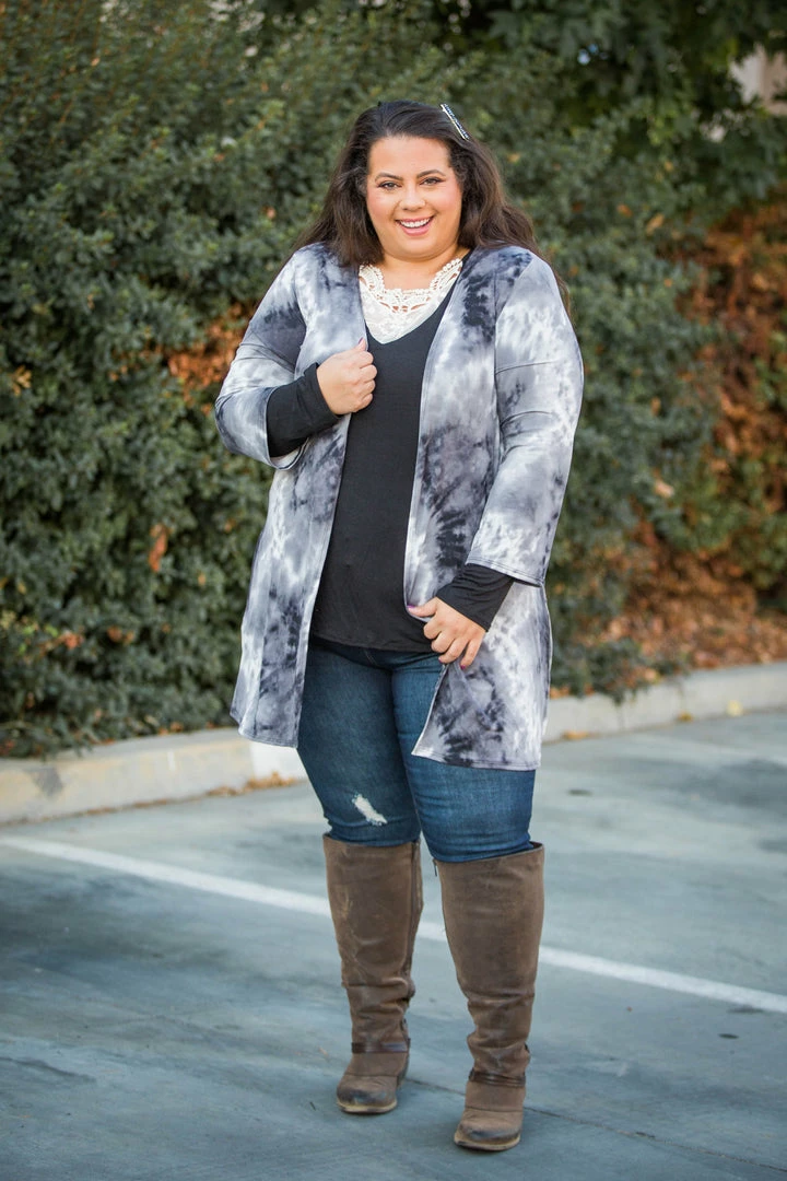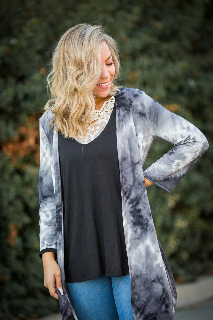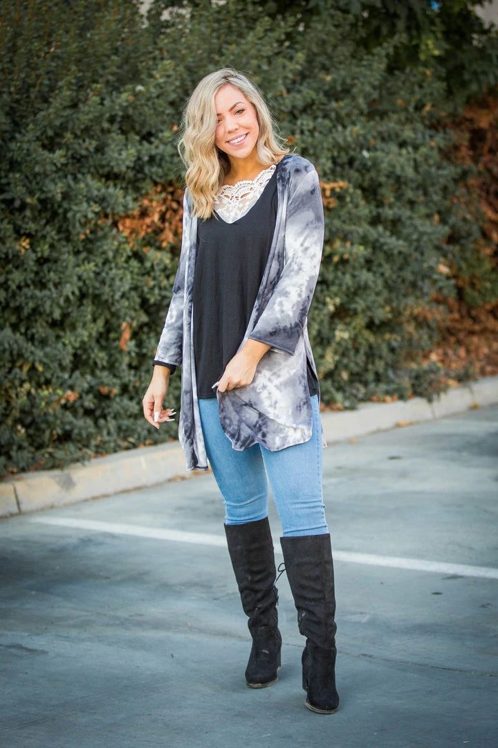 The subtle black and grey tie dye in this 3/4 sleeve open front cardigan is absolute perfection. Not only will it layer well over everything.