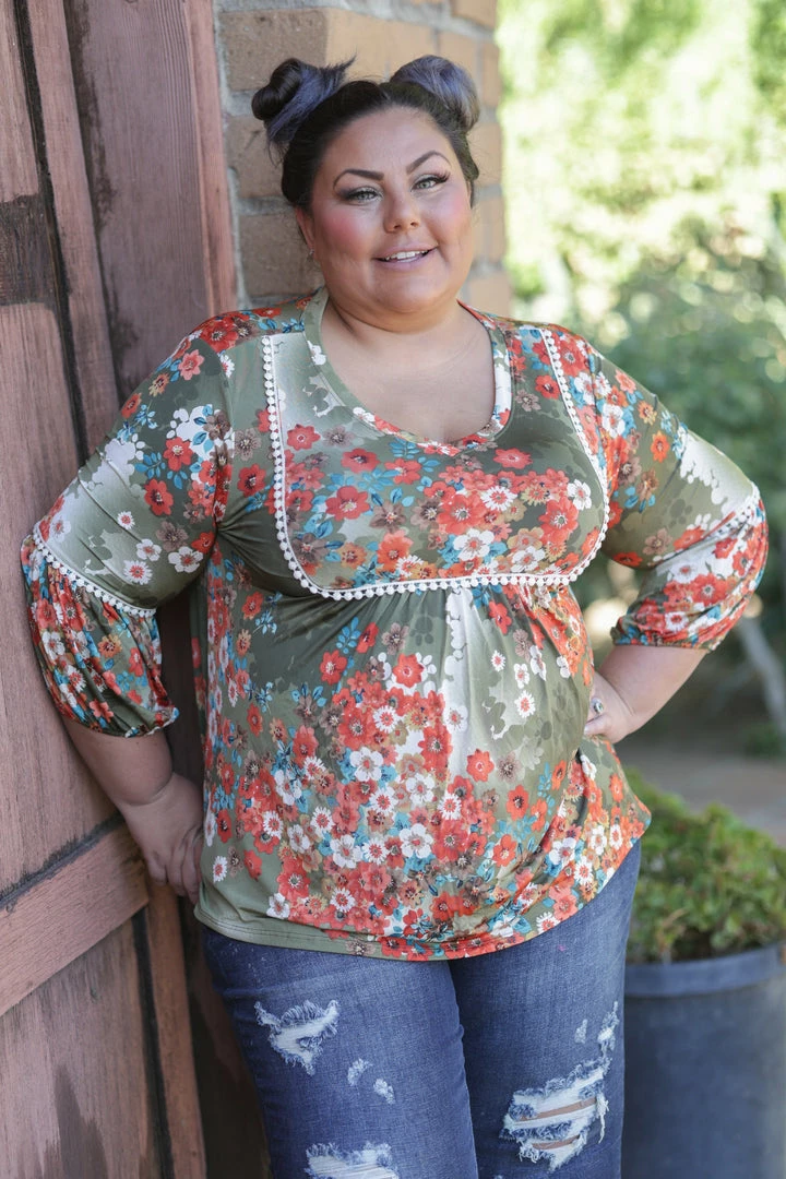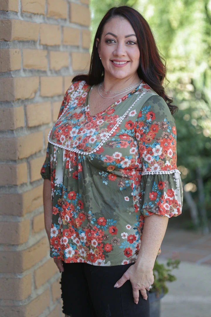 Floral! Floral! and more Floral! This floral 3/4 sleeve top is the perfect fall picnic piece! This flowy piece will add style to your outfit. The closer you look, you will see more and more detail. This top has capped sleeves, embroidered accents on the sleeve and chest, and folds on the front.