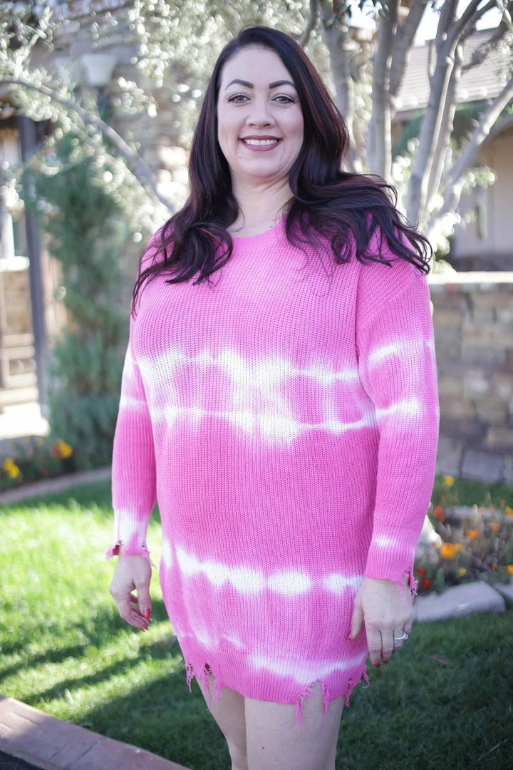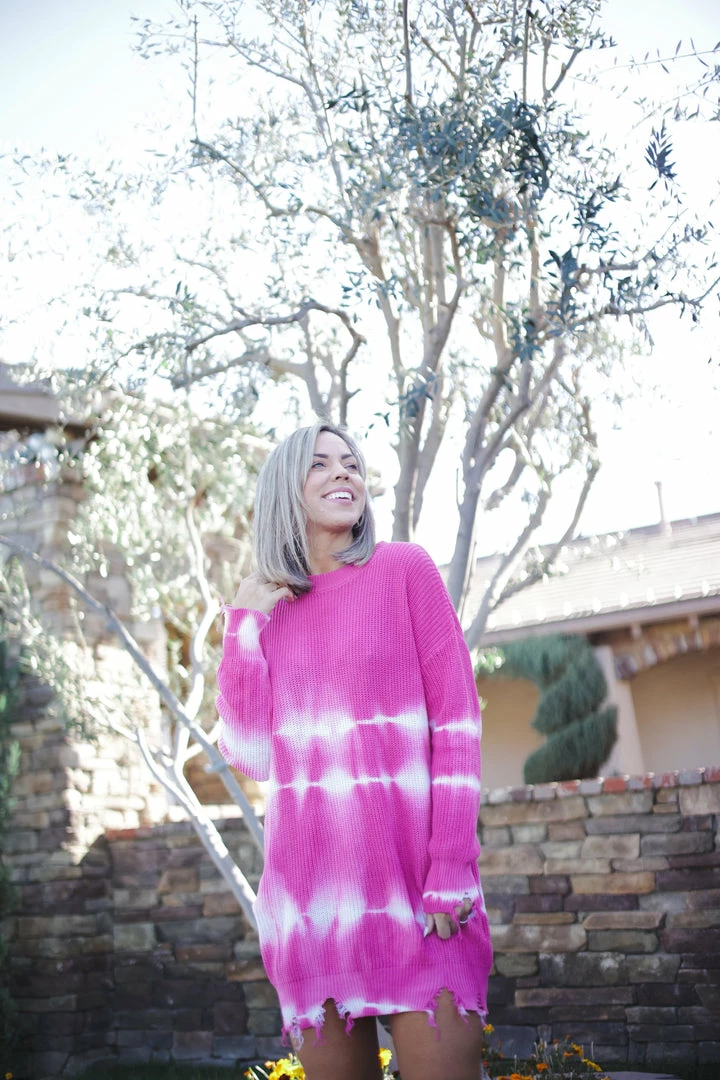 You can just feel the love radiating off of this hot pink, tie dyed sweater dress. Best part…you can also throw on some leggings and wear this as a tunic! With a straight cut, this dress features a round neckline, long sleeves and distressed hem details.