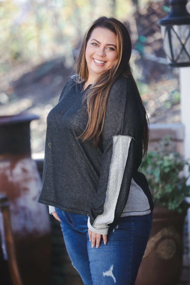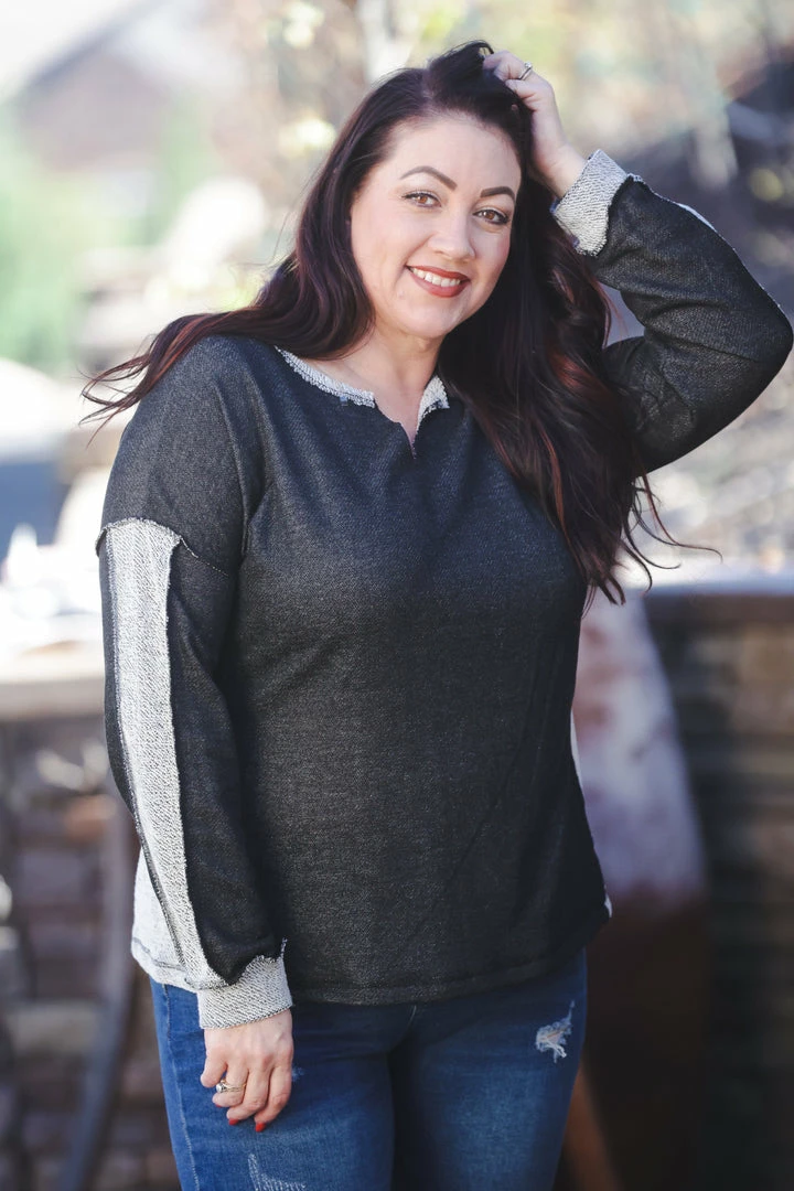 This amazing long sleeve top has just the right amount of colorblocking to make it absolutely unique. With a relaxed fit, this top features long banded sleeves, v-cutout neckline and rounded hem.