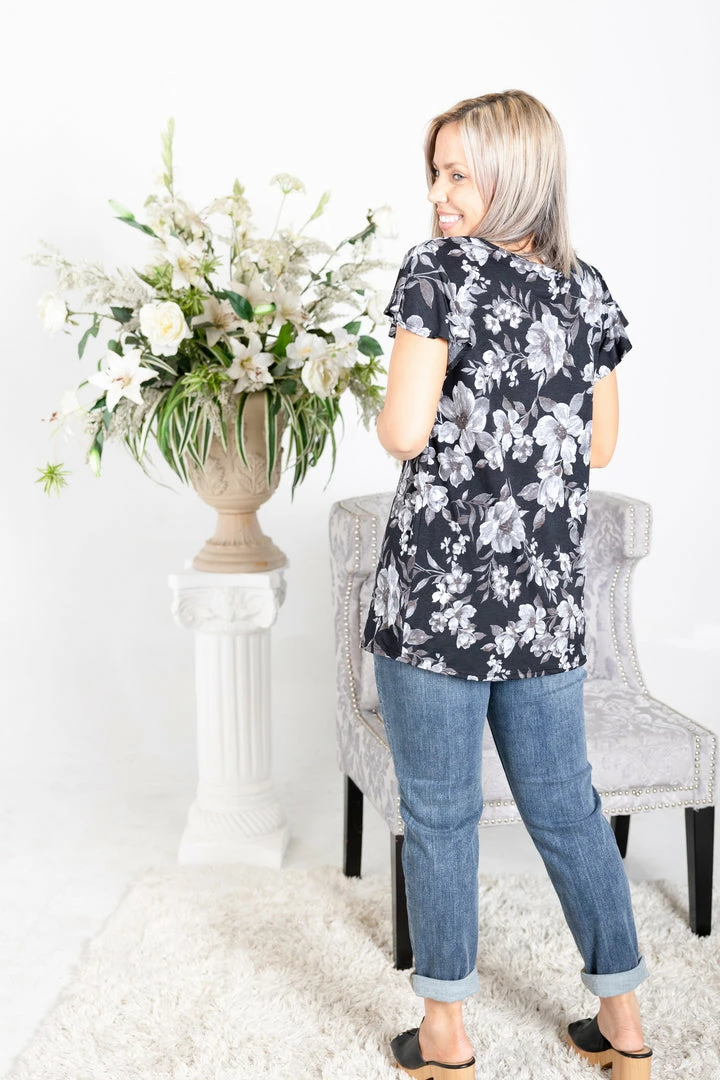 Sophistication meets edgy with this stunning peekaboo top. With a relaxed fit, this top features a round neckline with peekaboo detail, short flutter sleeves and rounded hem line.
