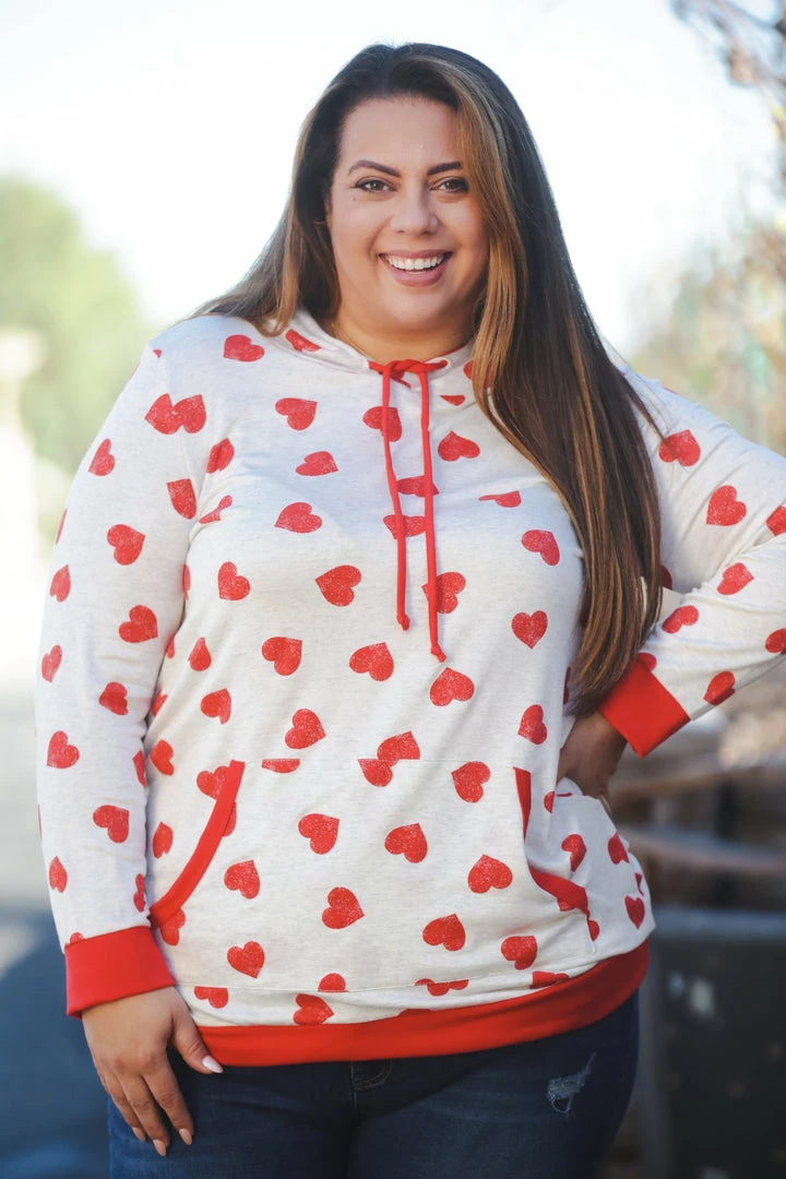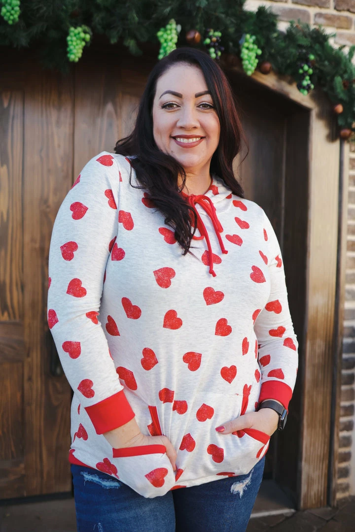 Follow your heart all the way to this amazing heart printed hoodie. Made from a lightweight material, this heathered oatmeal hoodie is perfect for any occasion. With a straight cut, this hoodie features long cuffed sleeves, a cuffed hem and kangaroo pocket.