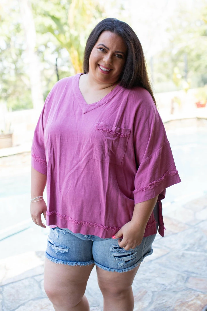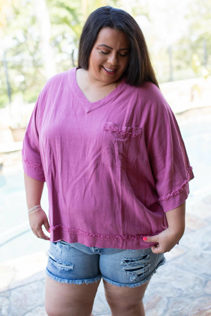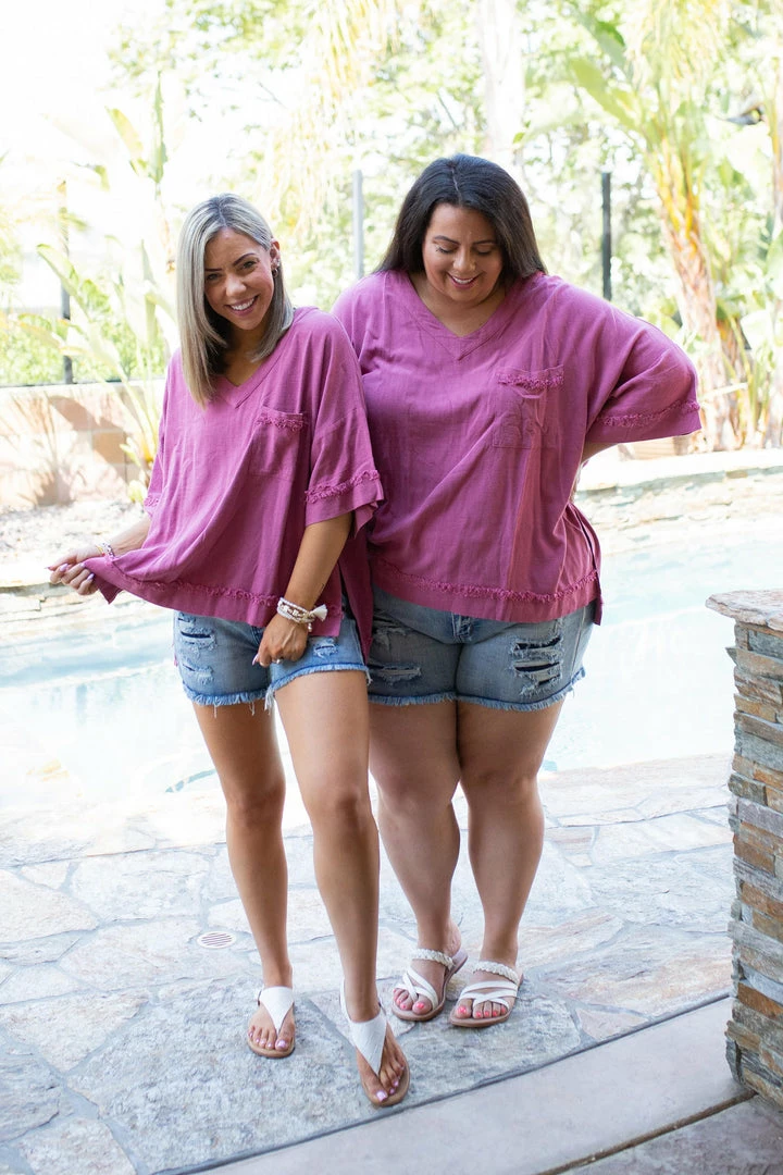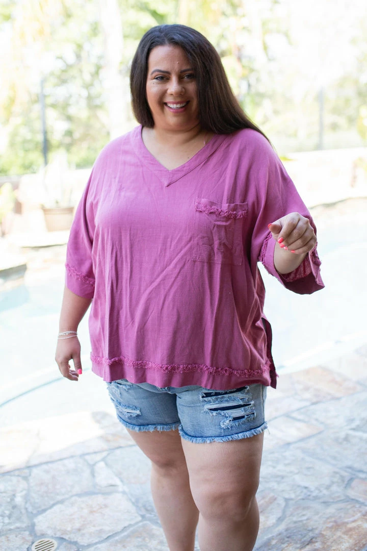 This oversized tunic top is the perfect piece to add to your closet, as it pairs so well with just about anything. The relaxed oversized fit, paired with the v-neck and frayed details make this top truly unique.