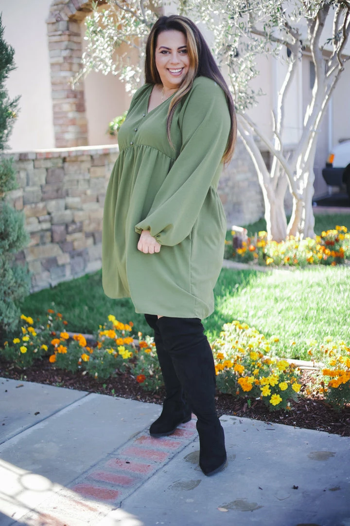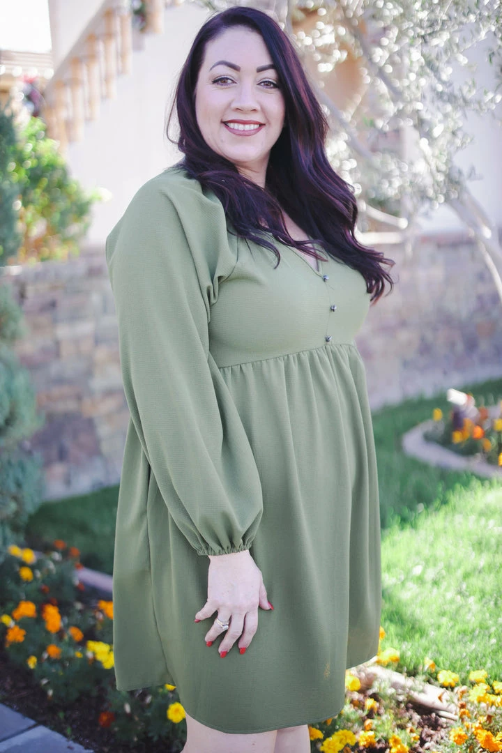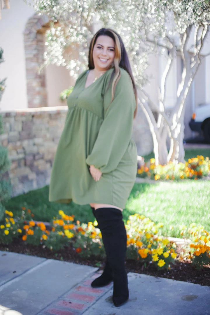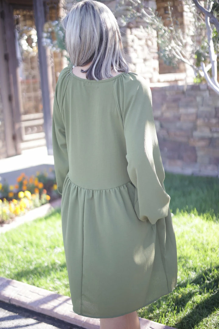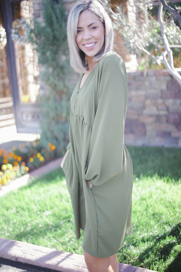 This buble crepe woven dress makes us want to frolic the day away. With a relaxed, boho fit, this dress features a v-neck with button details, long bubble sleeves and side pockets.