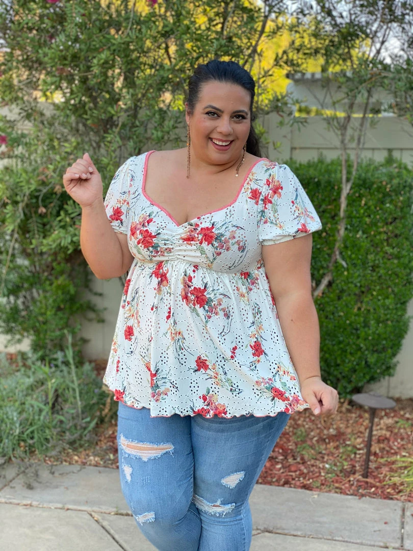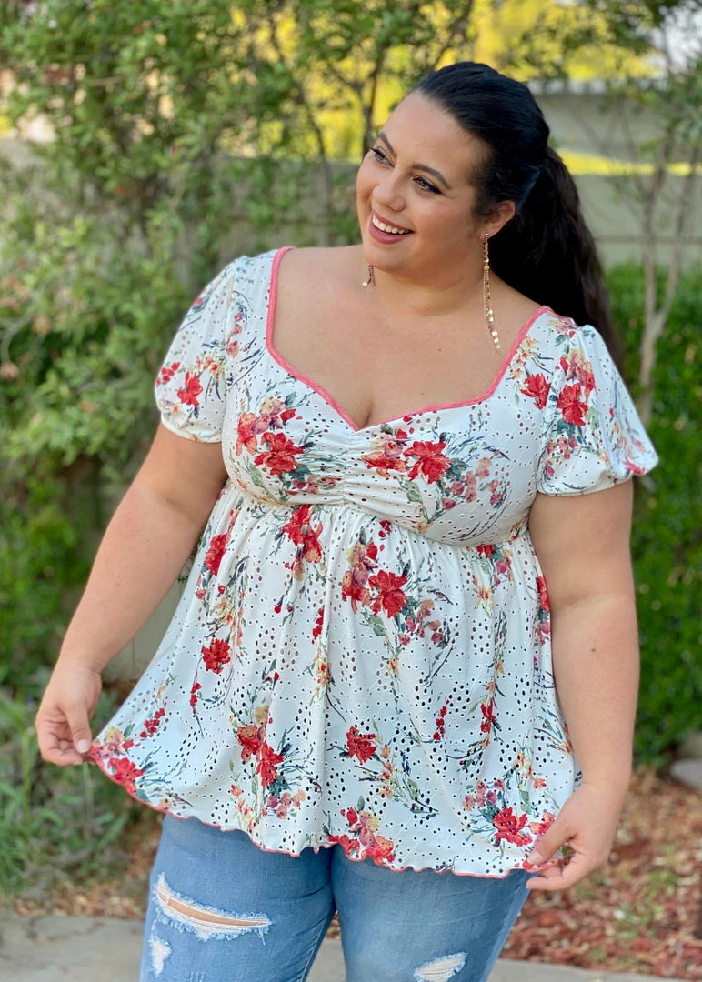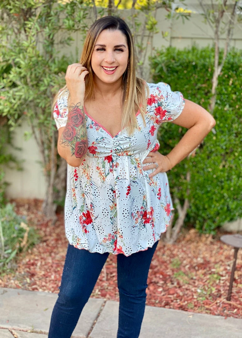 This babydoll top is unlike any babydoll that you’ll ever own. Not only does it make us feel like we are frolicking in a gorgeous wide open field, but the details are amazing. We especially love the unique v-neckline and ruched detailing on an eyelet backdrop, which is just the tip of the iceberg with the details. This top also features short sleeves, shirred pleated bodice detail and a marrow bottom detail.