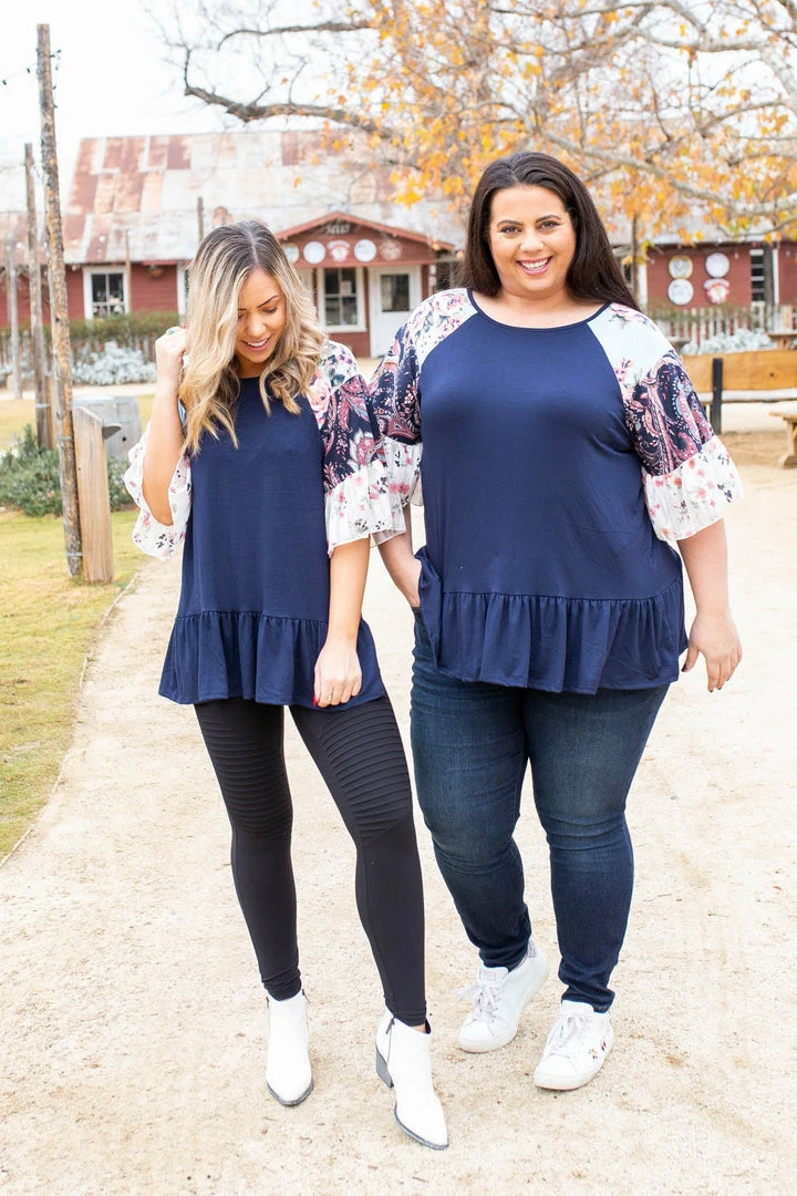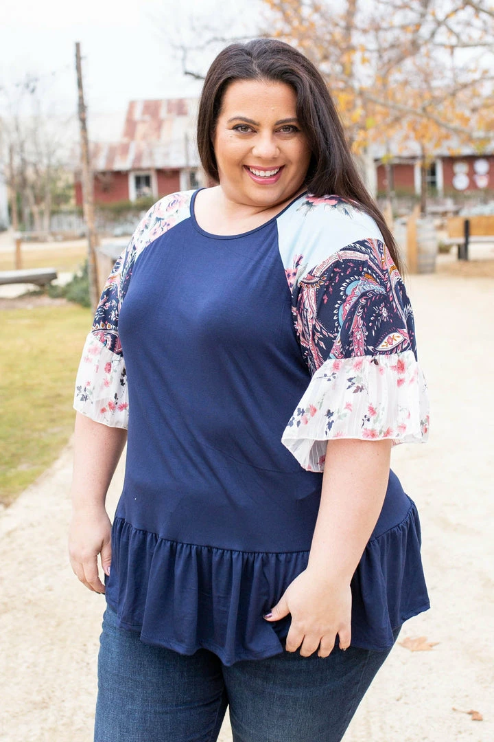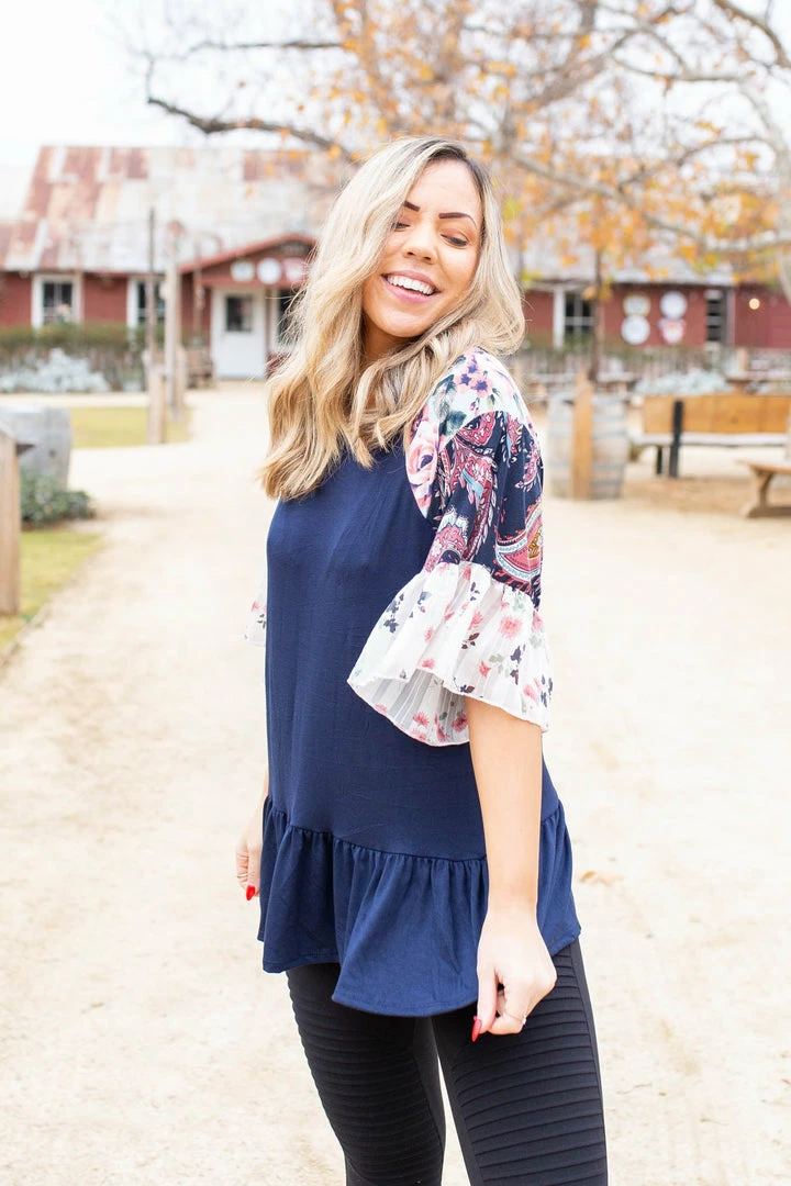 This ruffle sleeve top has us head over heels in love. The navy bodice is the perfect color to accentuate the paisley and floral colorblock ruffle sleeves. This super soft jersey top has a relaxed fit and features short ruffled sleeves and peplum ruffled hem.