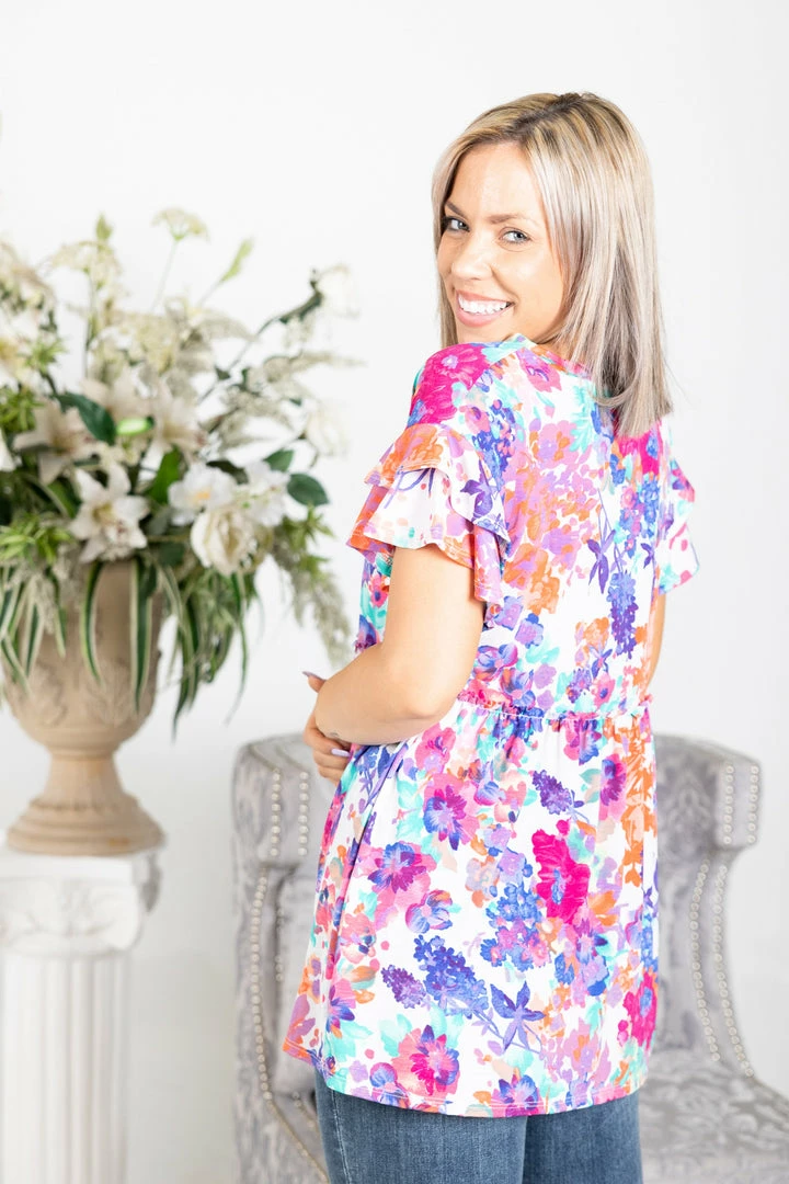 The color way in this floral babydoll are out of this world! Made from bulgari fabric, this top features a v-neck, short sleeves and rounded he.