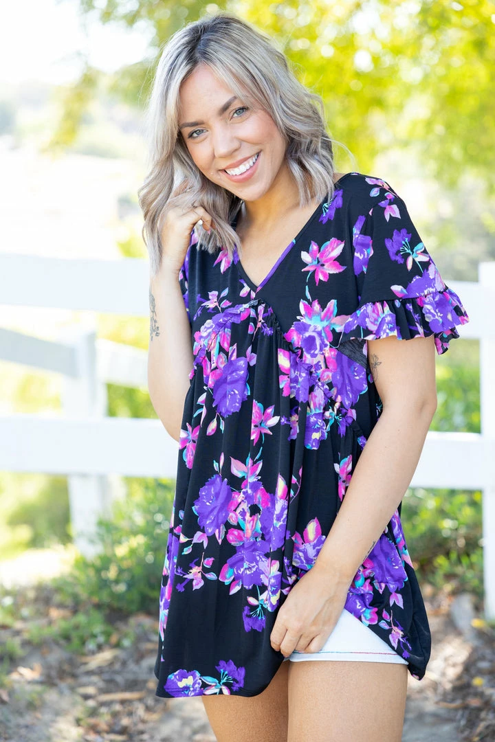 We are swooning over this vibrant purple and pink floral babydoll. Made from amazing bulgari fabric, this top features a v-neck, short ruffled sleeves and a ruffled empire waistline.