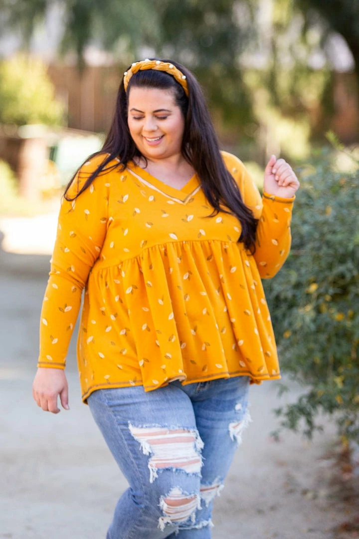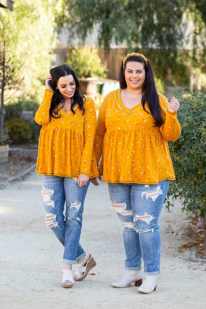 This babydoll top is unlike any other. The material is a soft, cozy terry material with plenty of stretch and the fit is sheer perfection, just like a golden sunrise. With a relaxed fit, this top features long sleeves a v-neck and reverse stitching details.