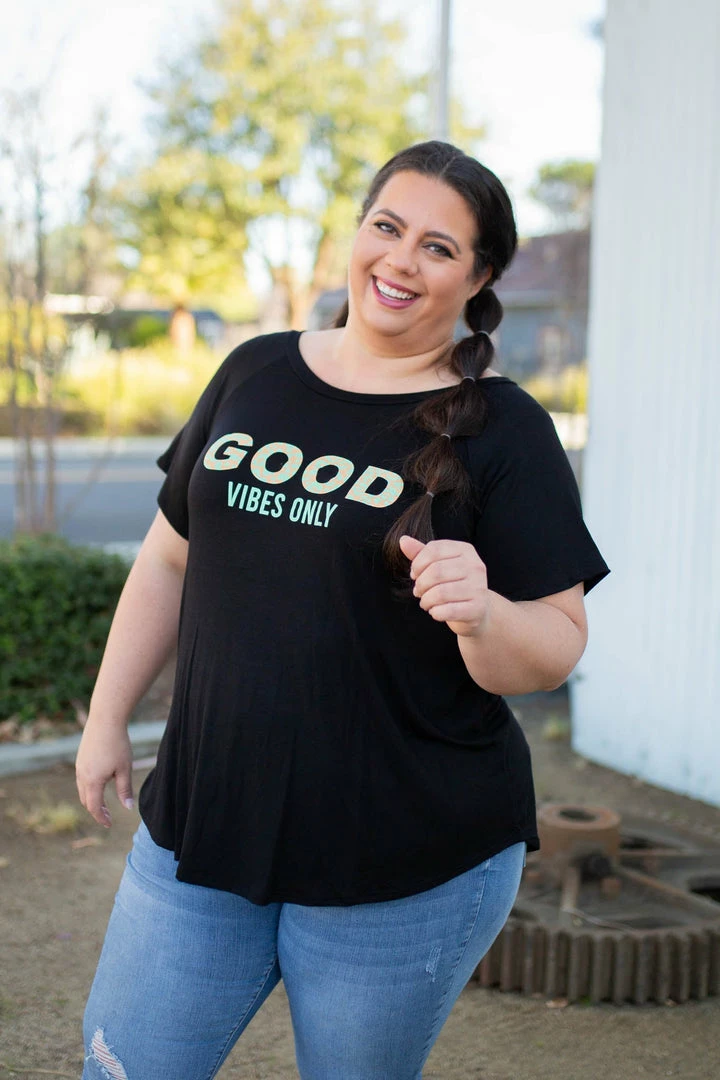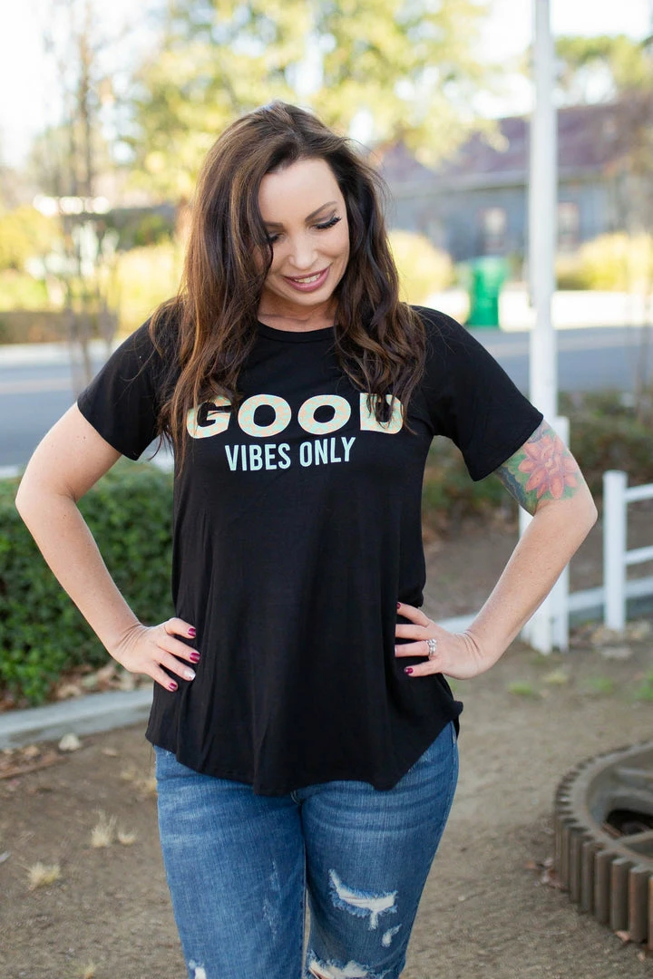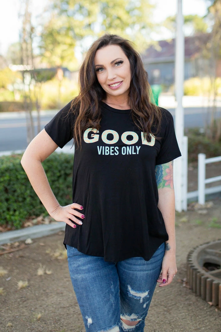 Nothing but good vibes while wearing this super comfy short sleeve top. With a relaxed fit, this top features short sleeves, a round neckline and rounded hem.