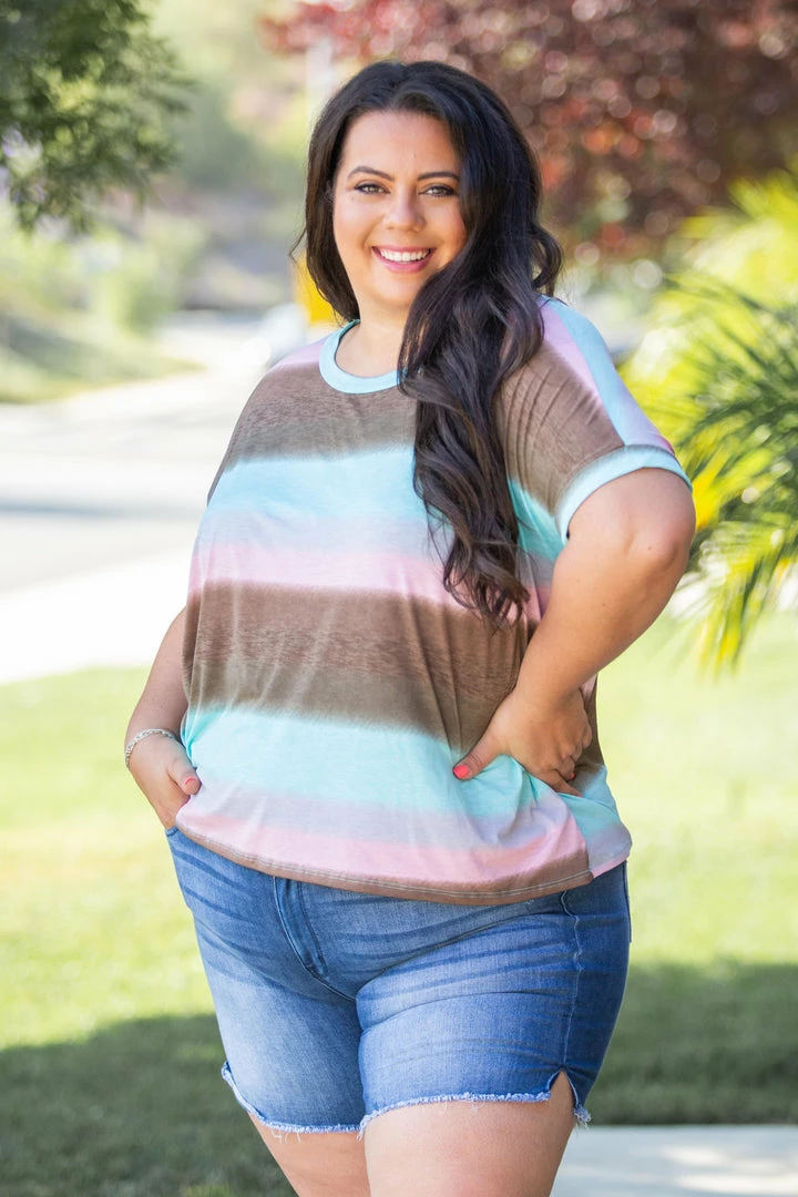 This lightweight boxy top has the most gorgeous gradient stripes. Featuring a round neckline with amazing contrasting detail, a relaxed fit and high low hem with side vent that pairs so well with everything.