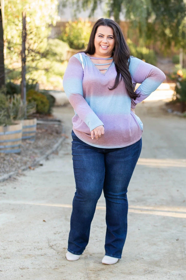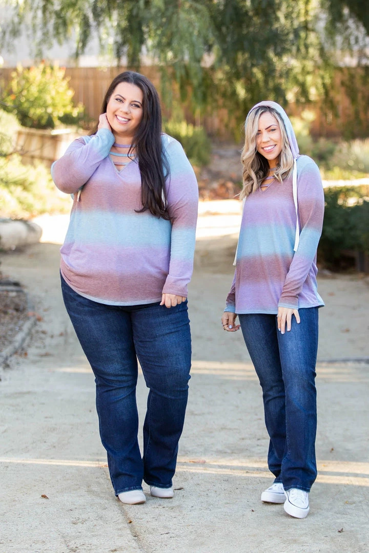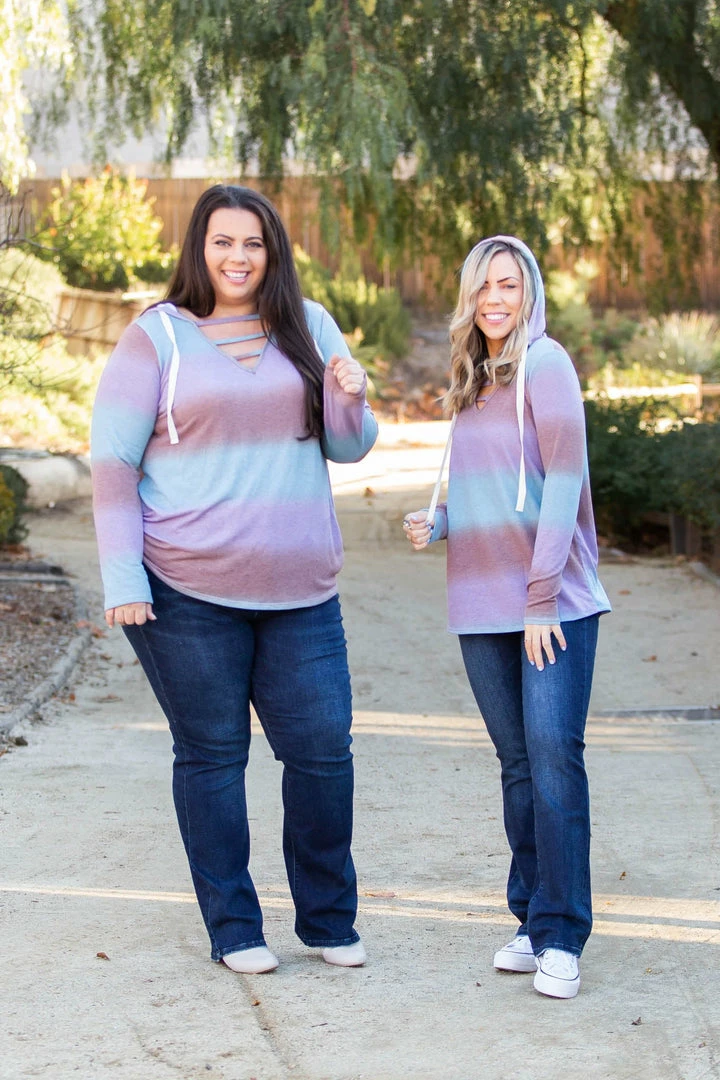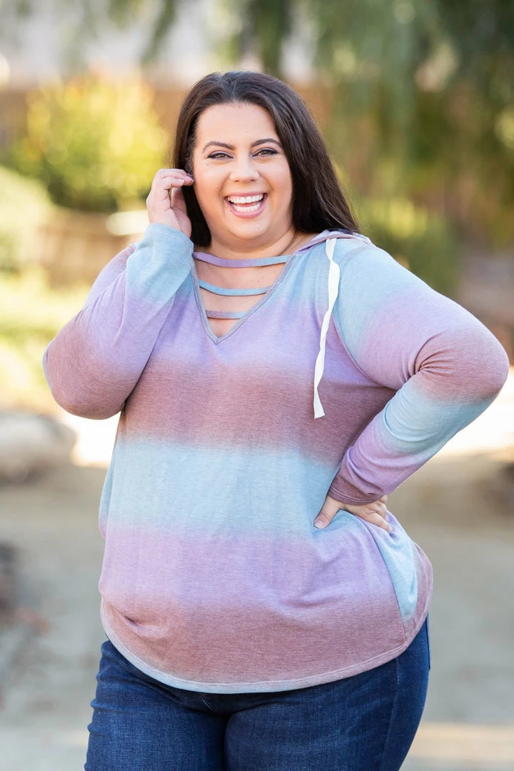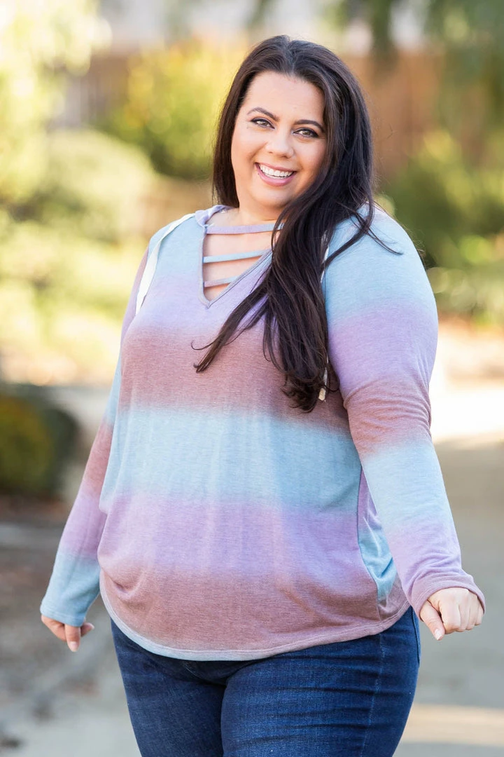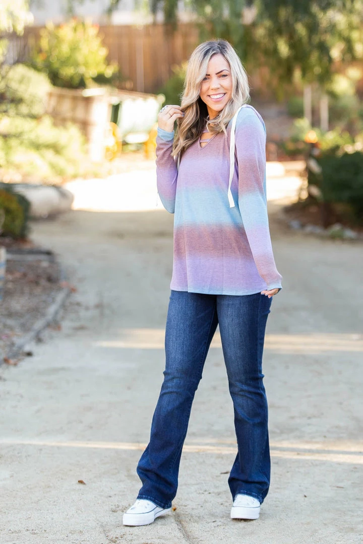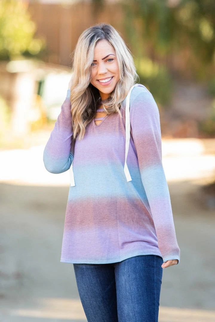 This lightweight hoodie has the most gorgeous gradient stripes. Featuring long sleeves, hood with a drawstring and lattice straps over the v-neck, this hoodie is everything and then some.