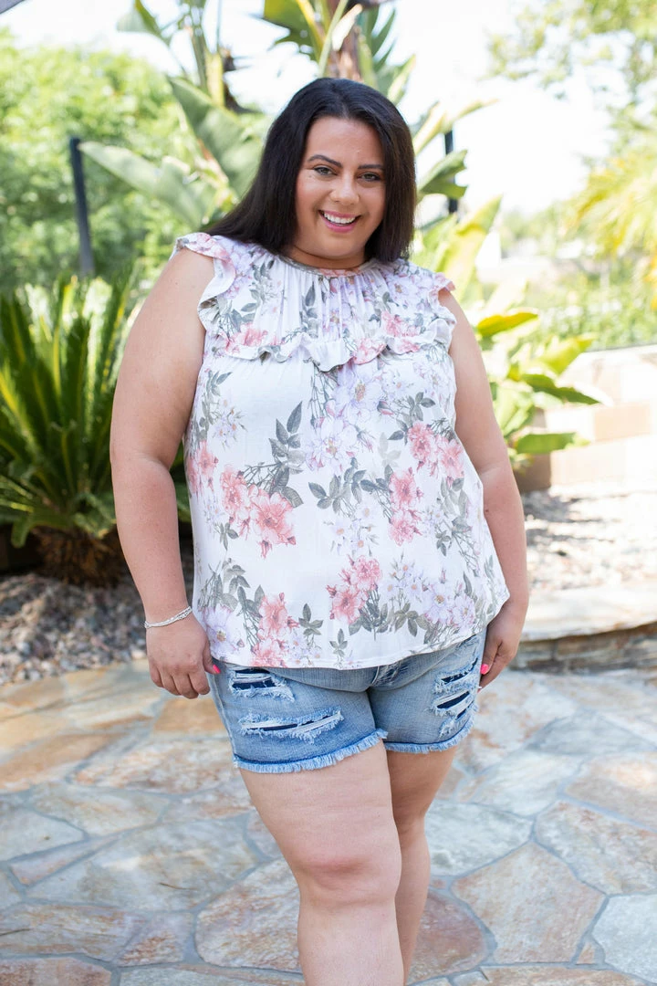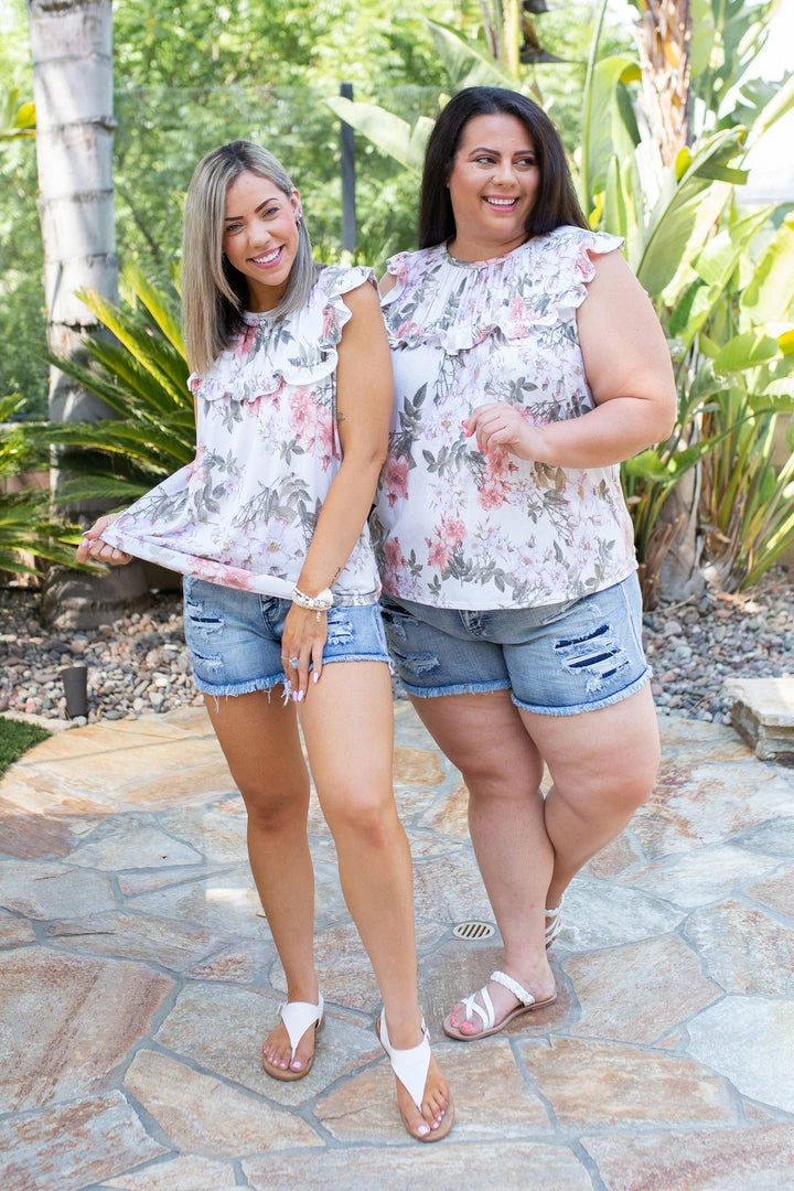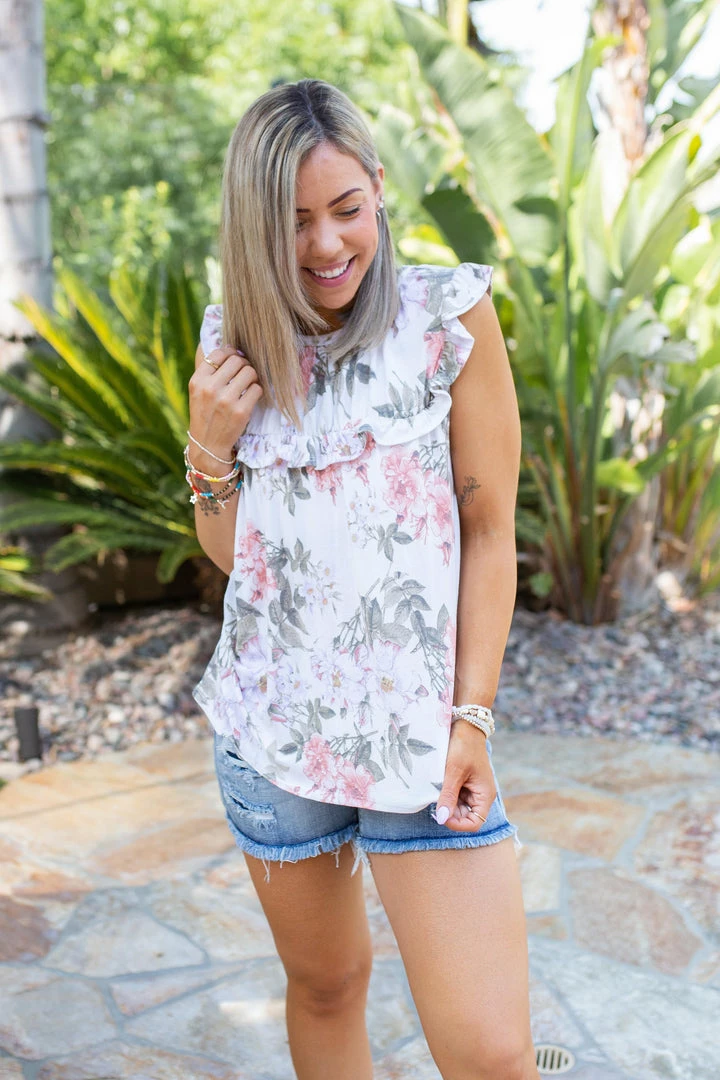 We are obsessing over this gorgeous floral printed sleeveless top! Such a great piece to dress up or down with, talk about versatility! With a relaxed fit, this top features a round neckline with ruffle detail and a rounded hem.