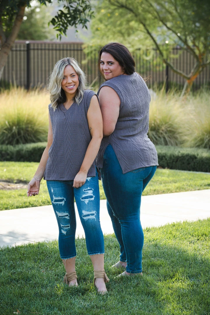 Curl up with a cup of hot cocoa in this amazing sweater tank. Wear this piece alone, or layered under your favorite cardigan for a complete and cozy look. With a relaxed fit, this top features a v-neck and hi lo hem.