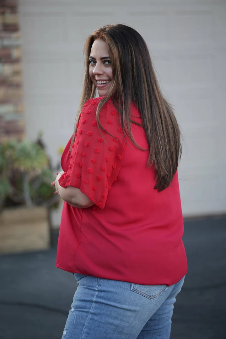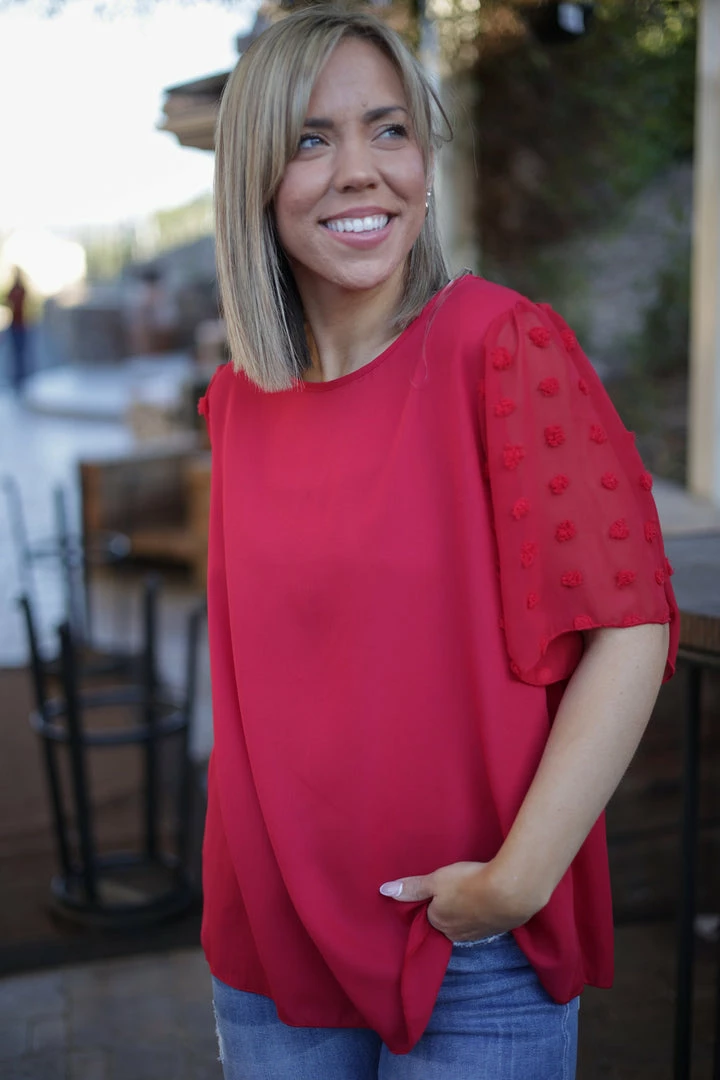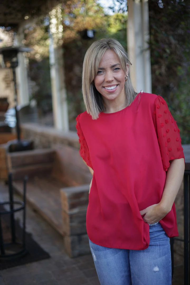 This true red woven blouse is the perfect piece to dress up or down with. With a relaxed fit, this top features a round neckline, sheer bell sleeves with mini popcorn detailing and a rounded hem.