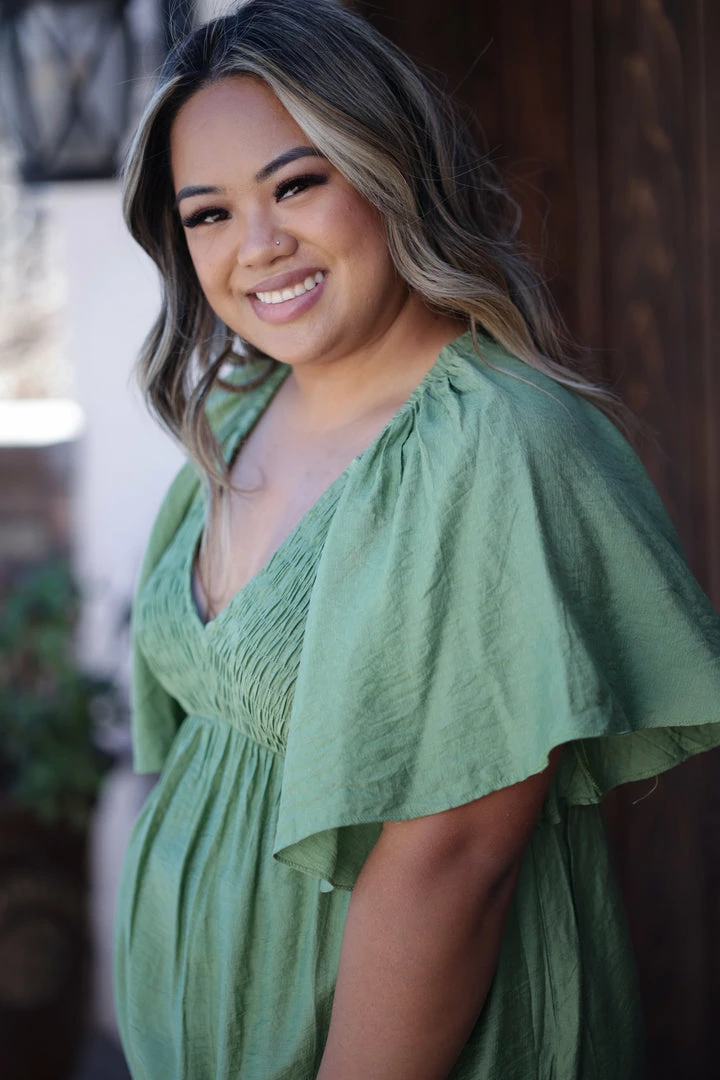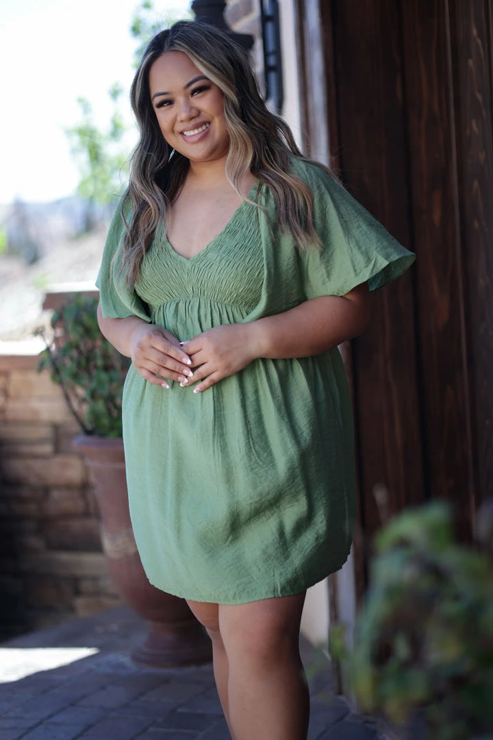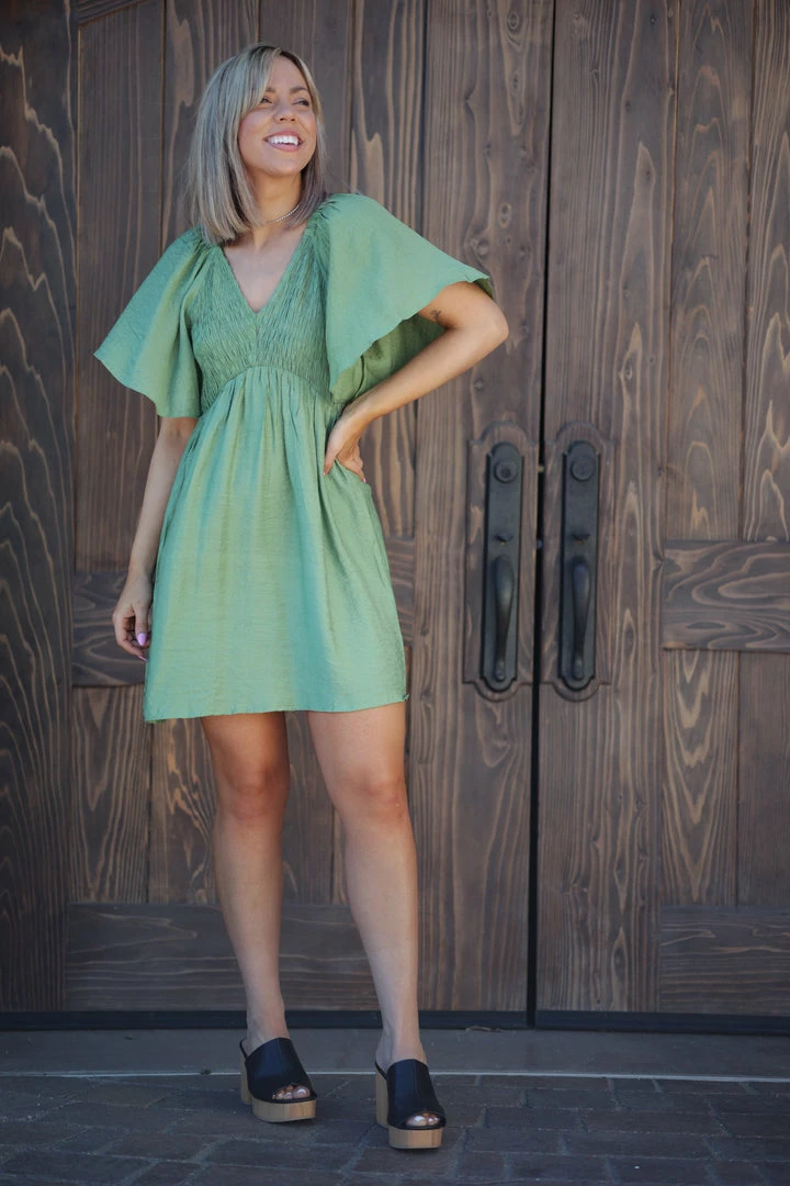 We are absolutey swooning over this olive dress. It is perfect for any occasion and it looks amazing on all body types. Made from the most amazing, lightweight fabric, this dress features a smocked v-neck, short flutter sleeves and rounded hem.