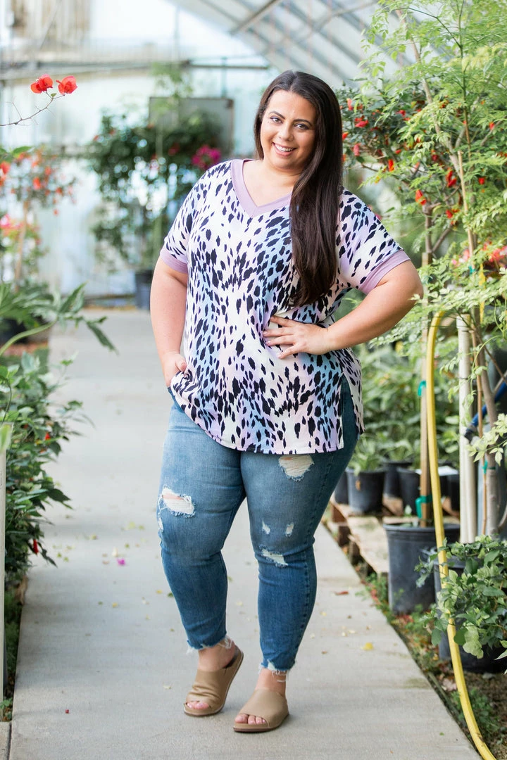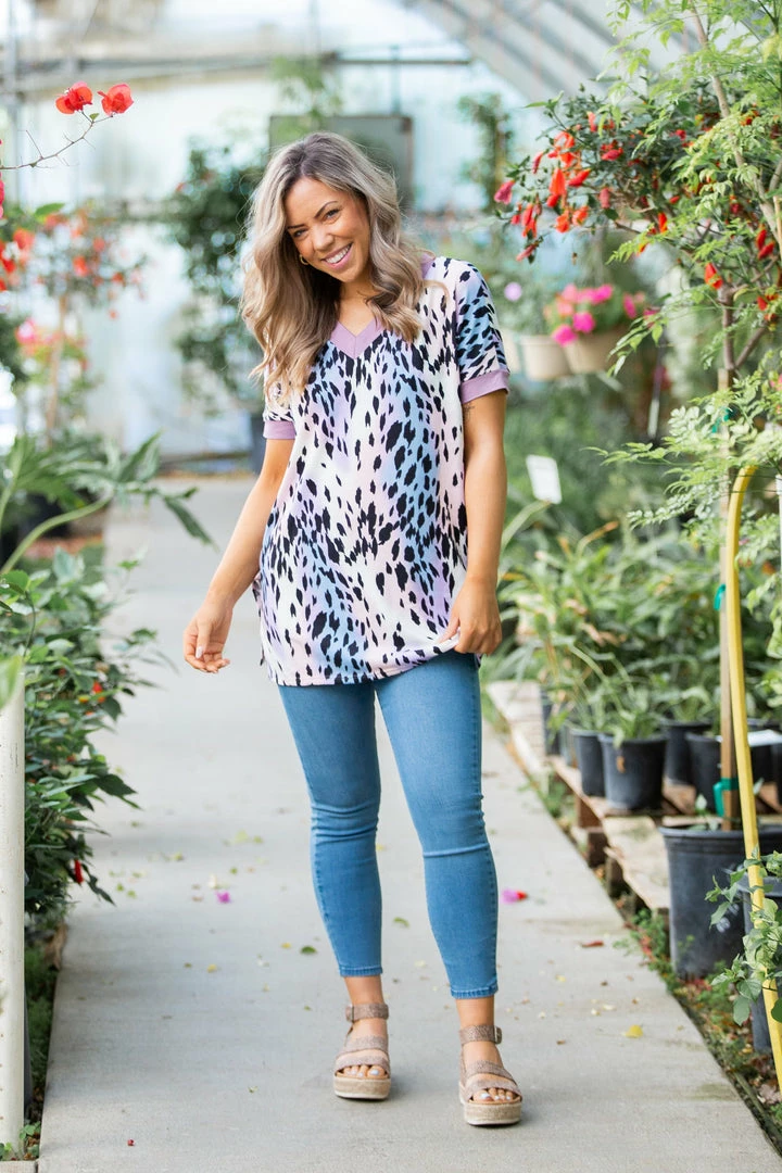 Oh so soft!!!! The amazing super soft brushed oakley material is to die for! A serious must have. Featuring a front and back v neck that is so pretty. Lavender detailing in the cuff and collar that brings out so much fun in this beautiful shirt!