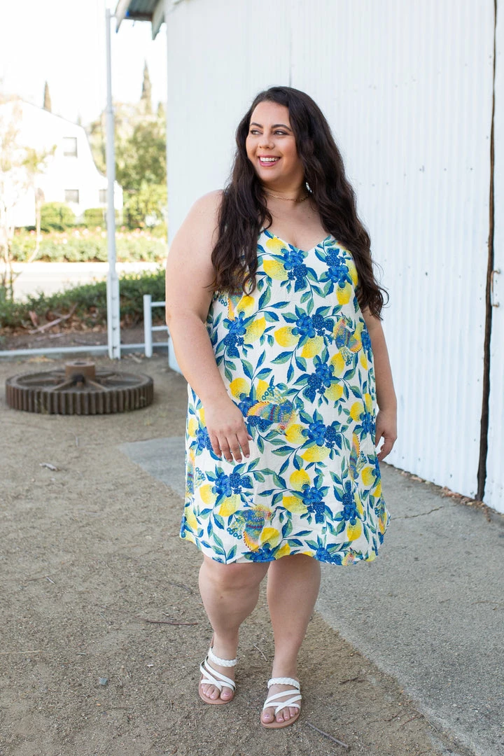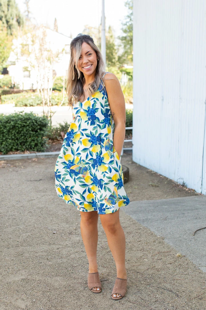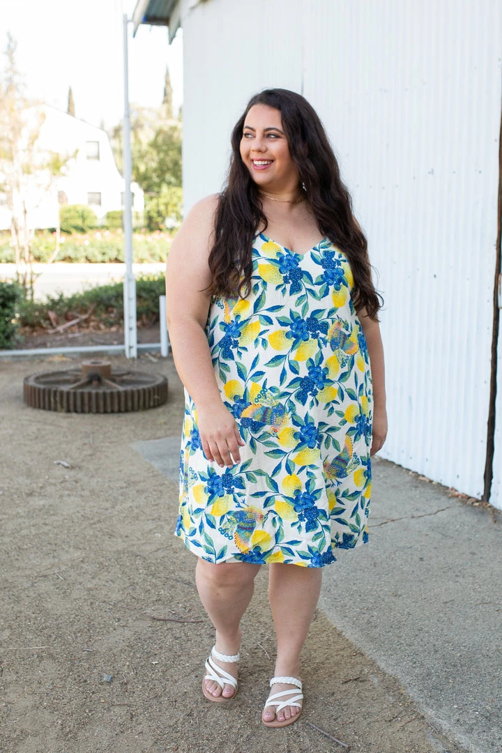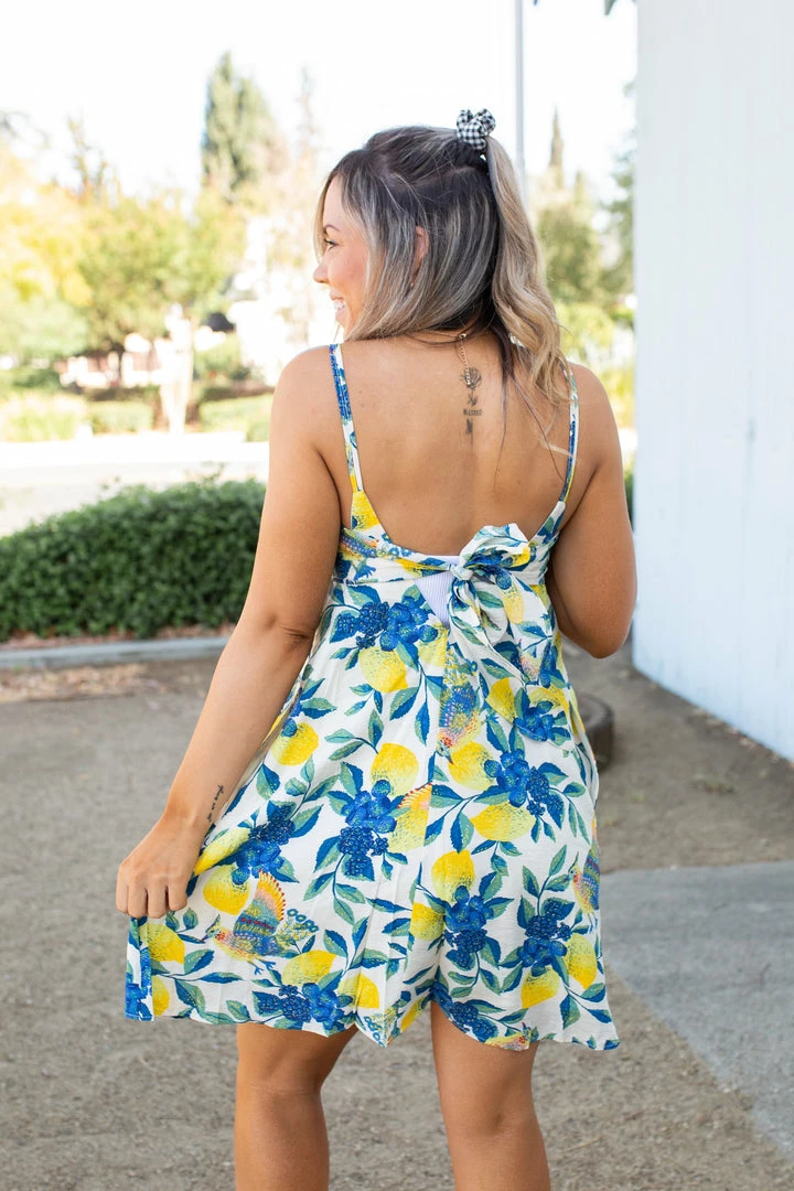 Like fresh squeezed lemons, this dress is as fresh as it gets. Seriously the perfect summer print with the lemons, berries and birds. With a relaxed fit, this dress has a self close tie in the back so you can really make it fit your body best. This dress is lined to perfection so there is nothing sheer about it, and it also has pockets!
