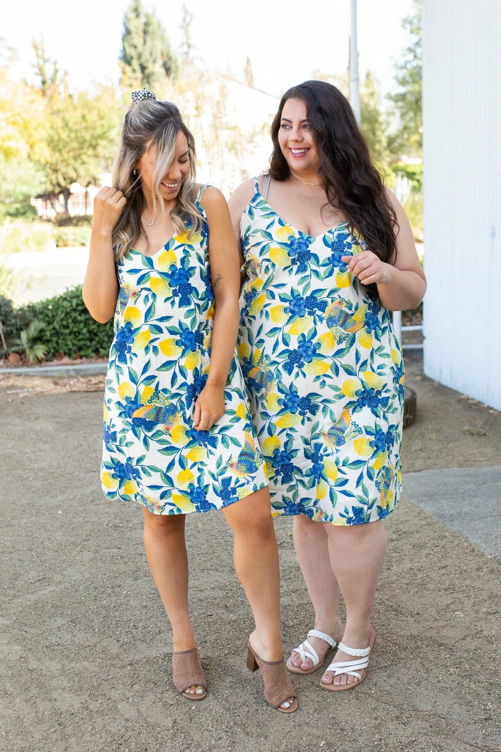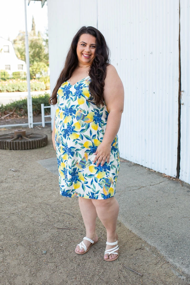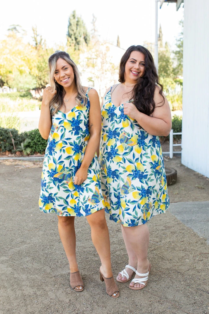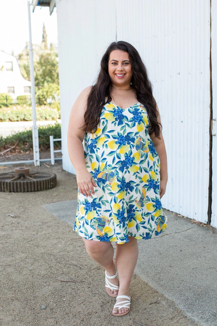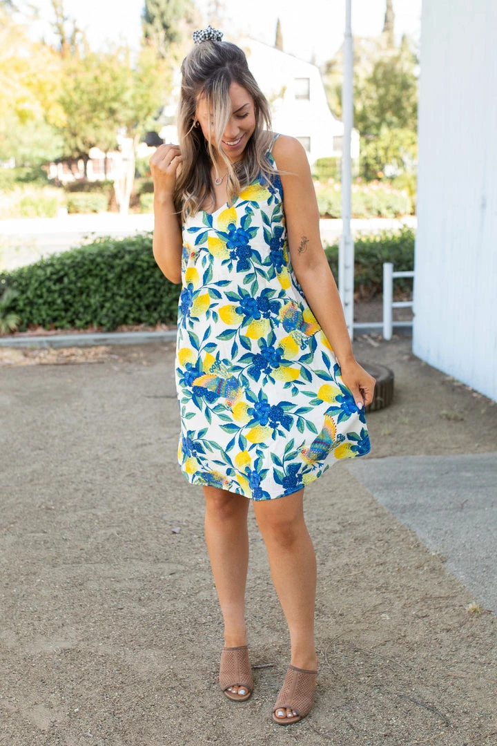 Like fresh squeezed lemons, this dress is as fresh as it gets. Seriously the perfect summer print with the lemons, berries and birds. With a relaxed fit, this dress has a self close tie in the back so you can really make it fit your body best. This dress is lined to perfection so there is nothing sheer about it, and it also has pockets!