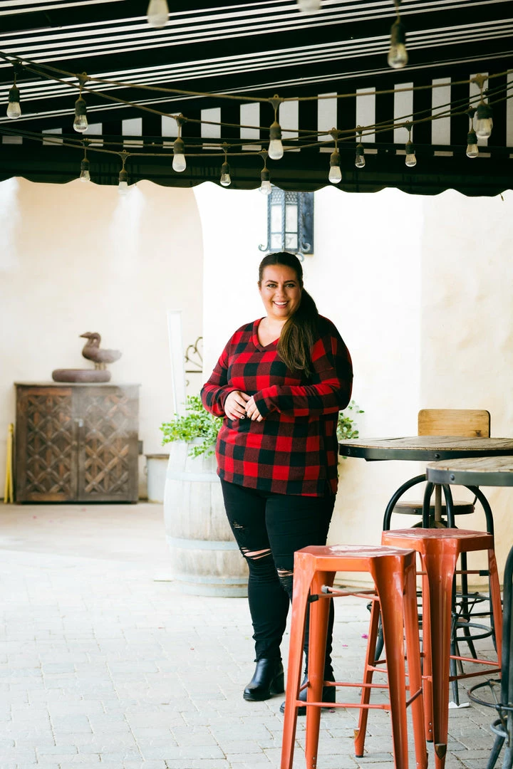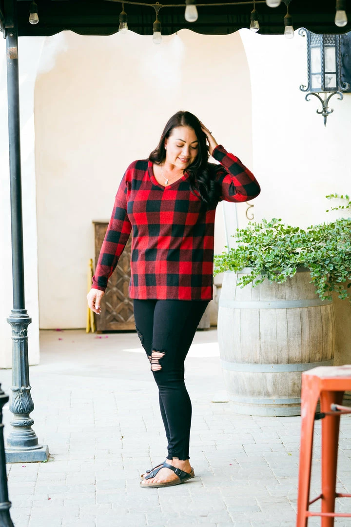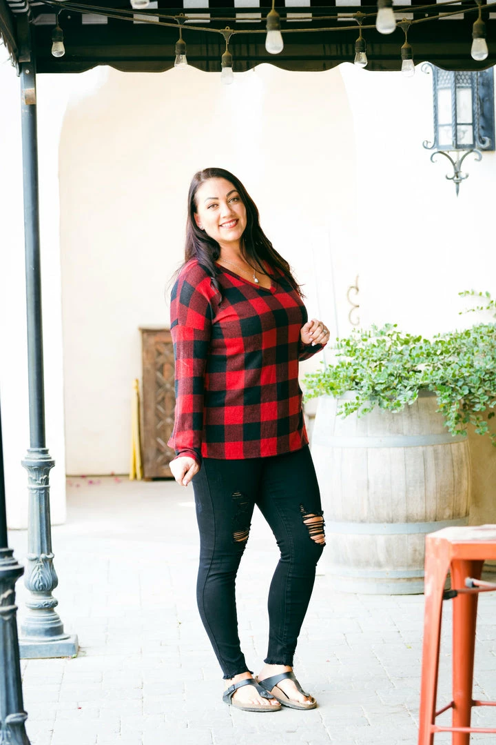 We are mad about plaid, and this deep v-neck pullover takes the cake. Featuring long sleeves, and a rounded hi-lo hem, this pullover looks amazing on all body types.