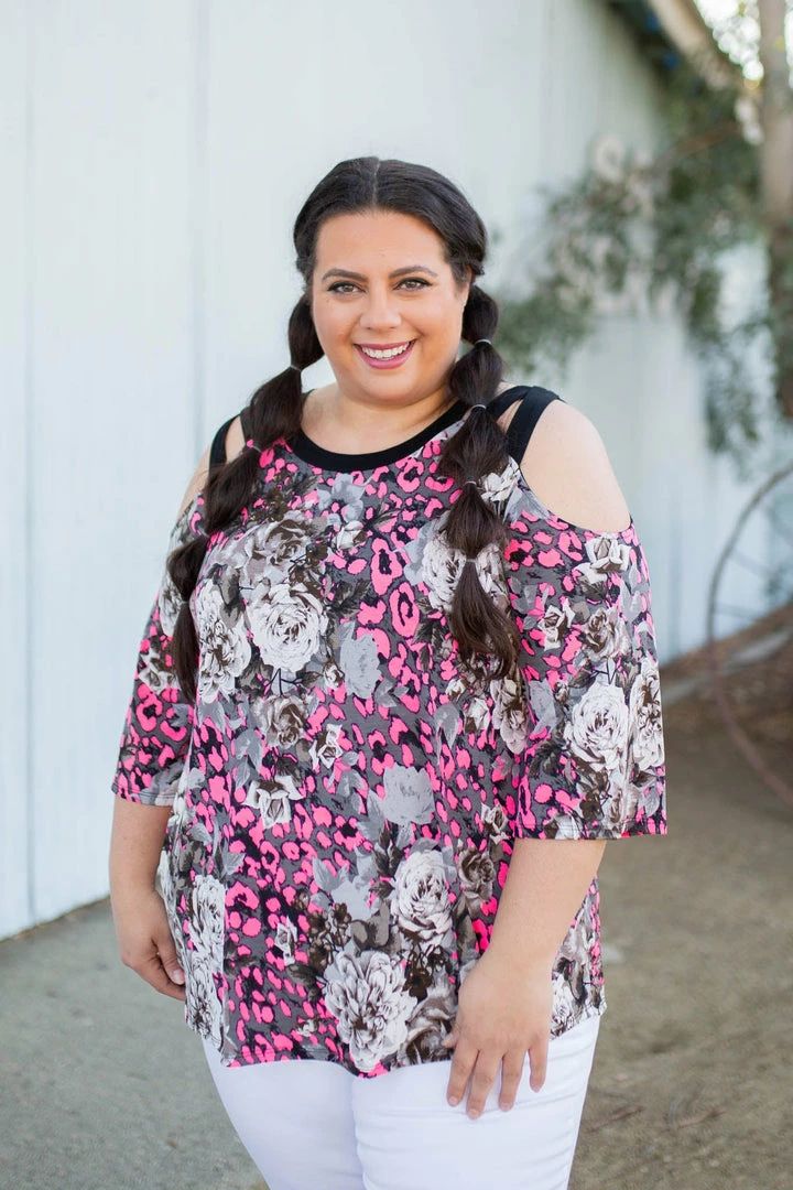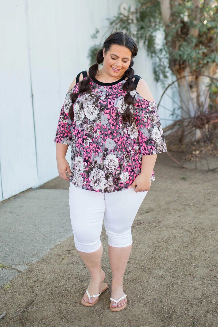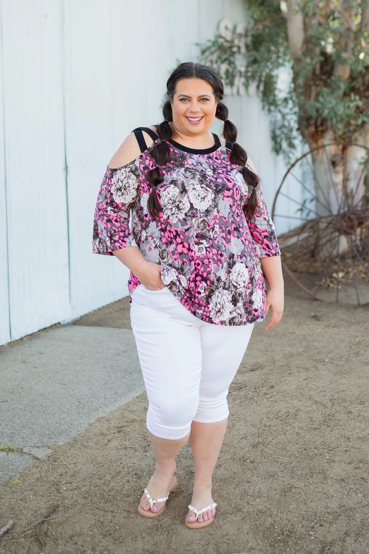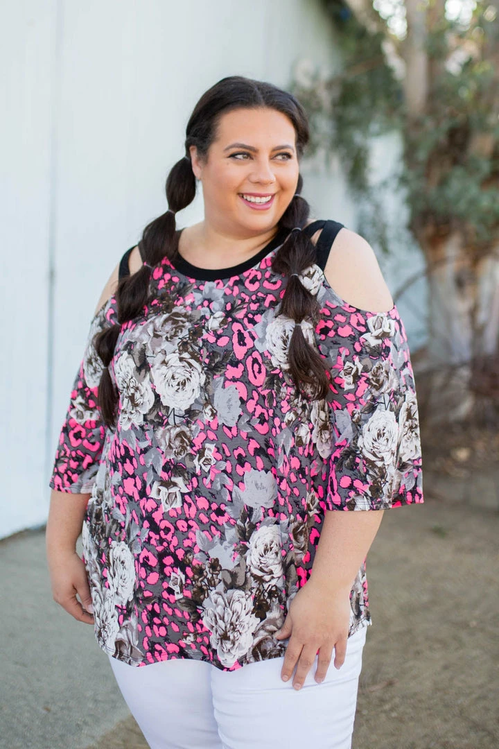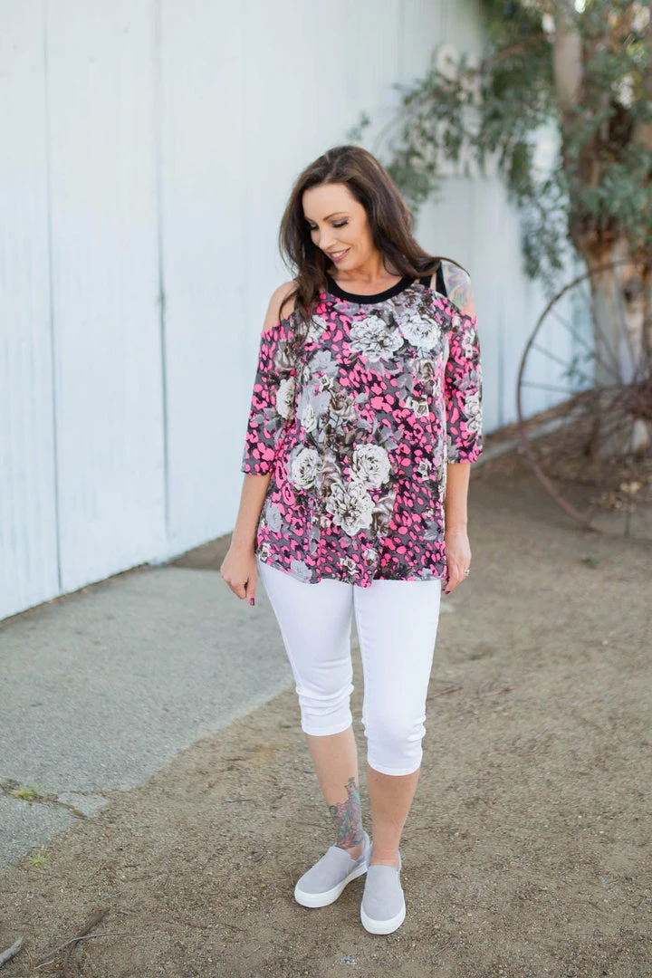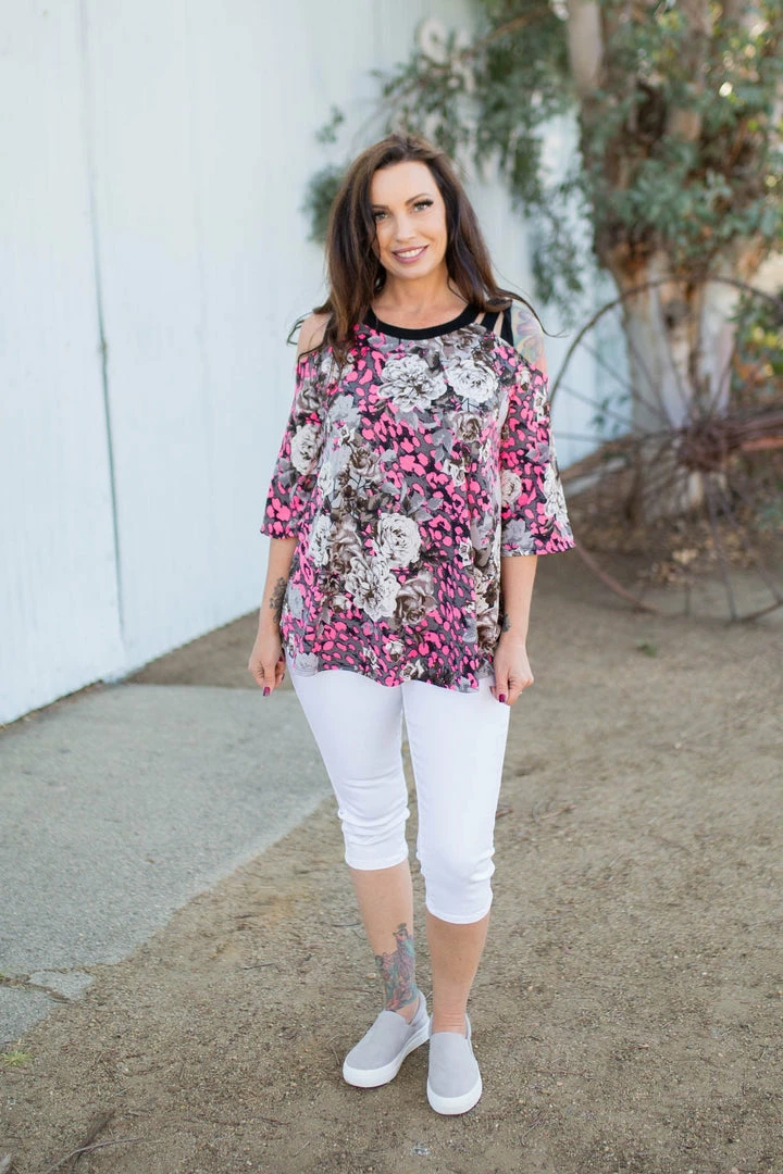 You will absolutely make yourself happy in this stunning 3/4 sleeve cold shoulder top. With a relaxed fit, this top features 3/4 sleeves with caged shoulder straps and a round neckline.