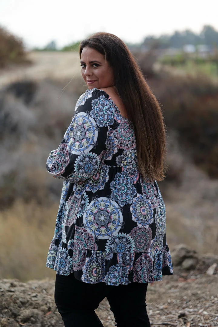 We are swooning over this medallion printed tunic. Made from buttery soft fabric, this tunic can also be worn as a dress, so versatile! Featuring an elastic square neckline that can be worn on or off the shoulder, 3/4 balloon sleeves and ruffled hem.