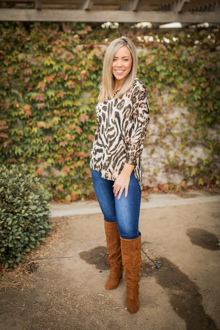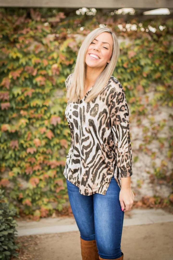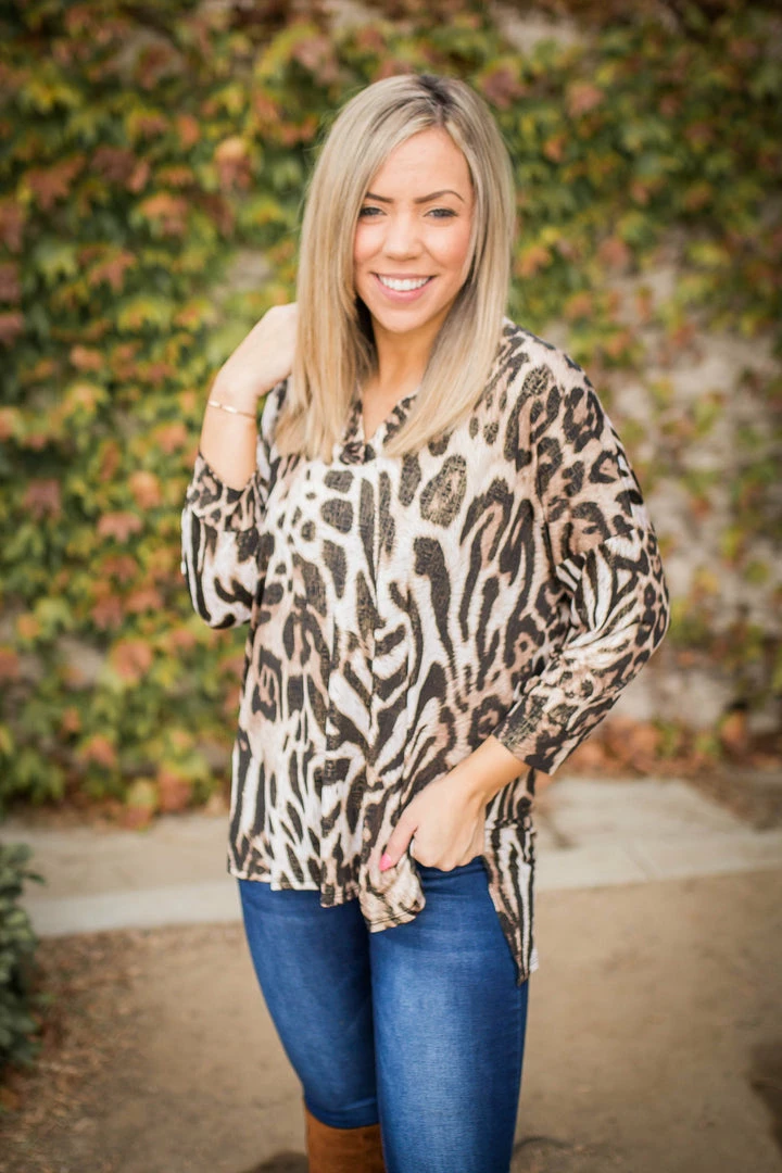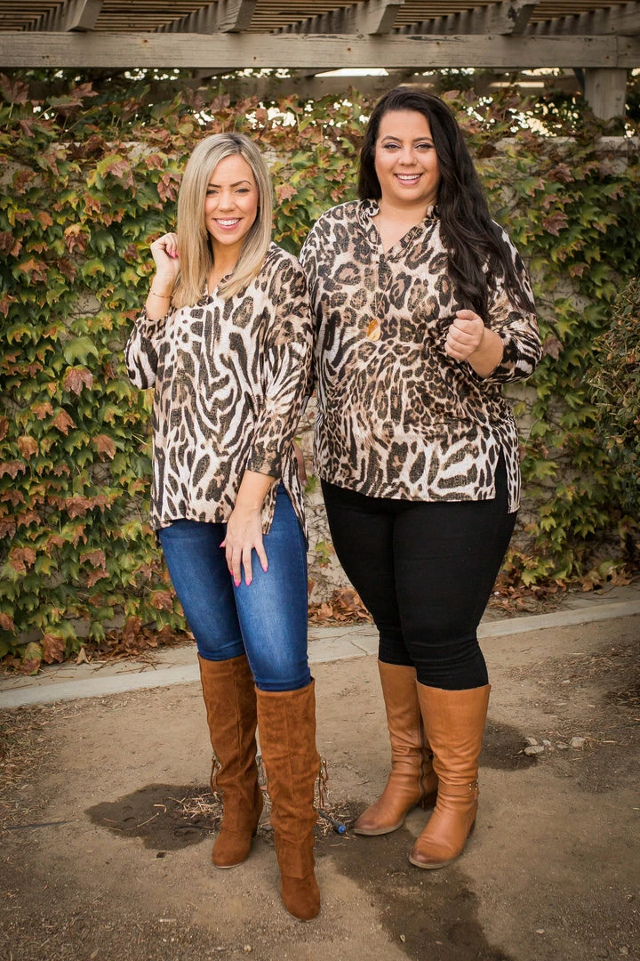 Searching for the perfect lightweight tunic? Look no further. This animal printed gabby is threaded with gold fabric throughout to really make this top pop! Featuring a banded collar, v-neck and buttoned 3/4 sleeves, this top will make getting dressed seem effortless.