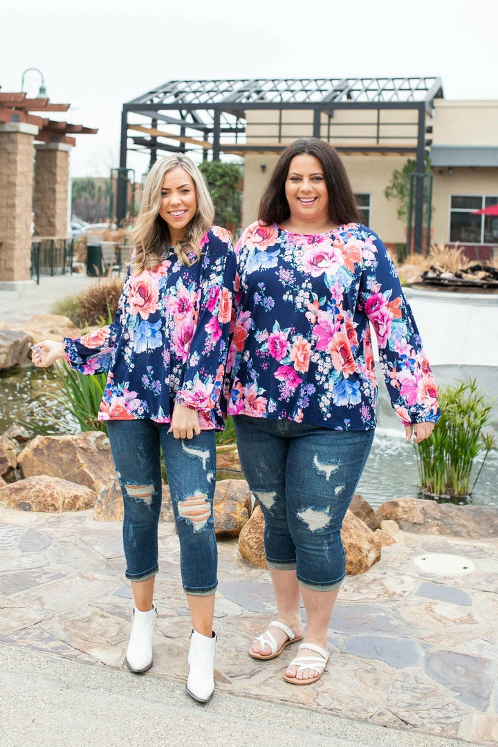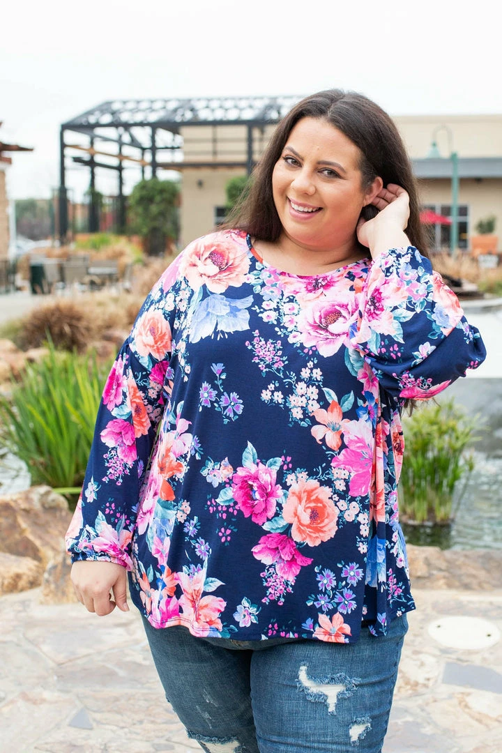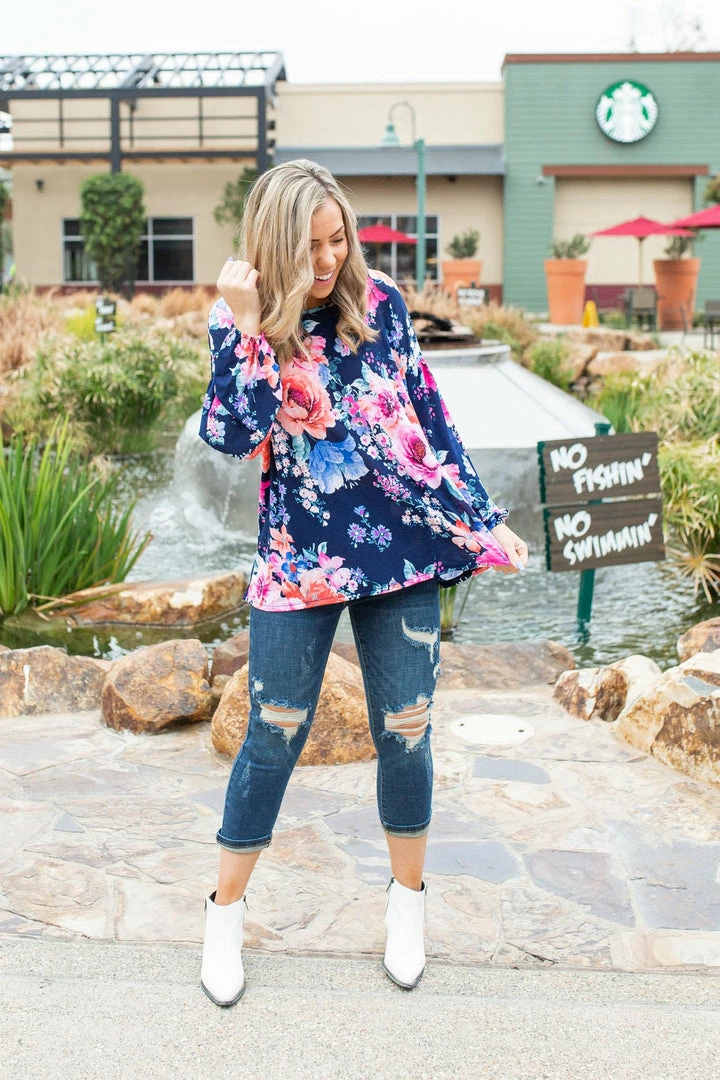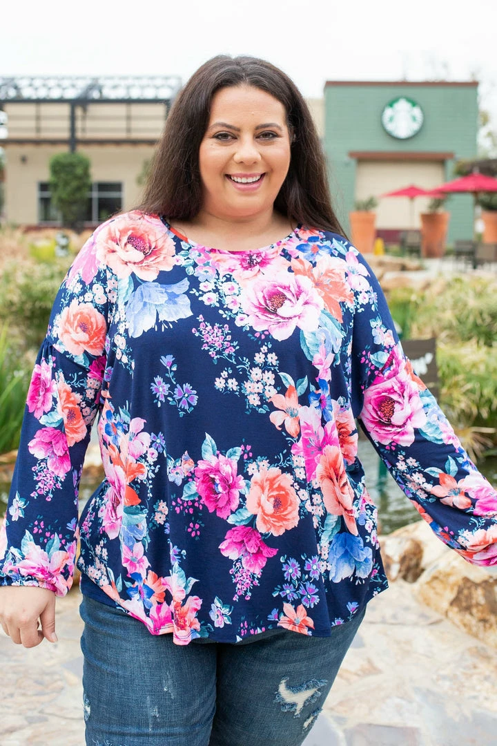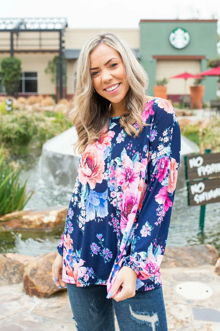 Made from bulgari, this long sleeve top is nice and lightweight. The navy background really makes the pink, coral and periwinkle flowers pop. Featuring a round neckline, bishop sleeves and a relaxed fit, this top is perfect for any occasion.