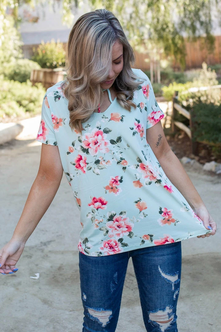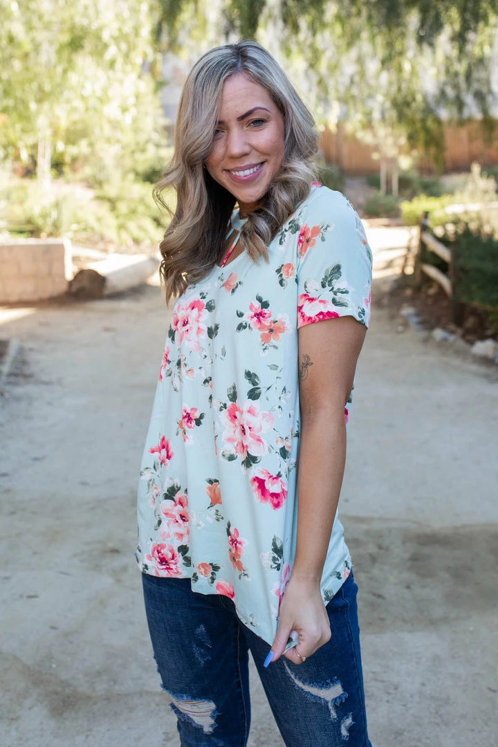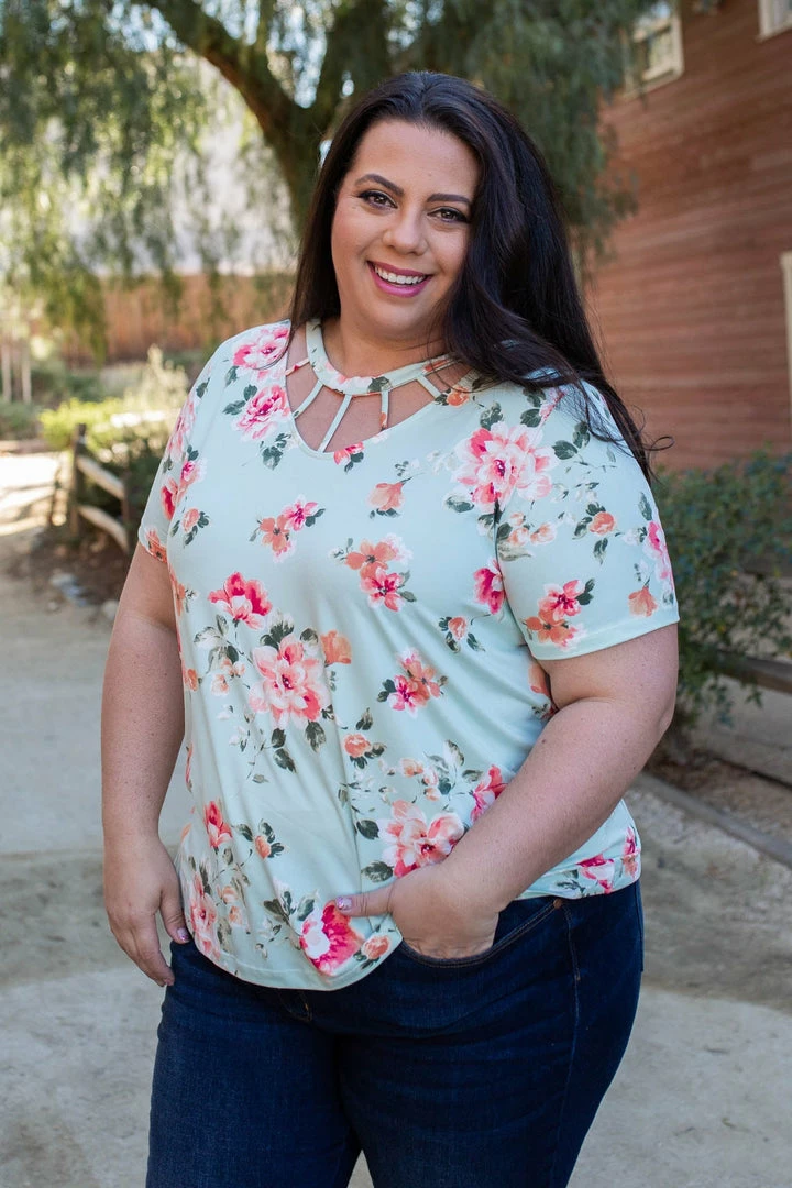 Made from buttery soft baby suede, this minty floral caged neck short sleeve top adds just the right amount of edge to your Spring wardrobe. With a relaxed fit, this top features short sleeves and a round neckline with caged detail.