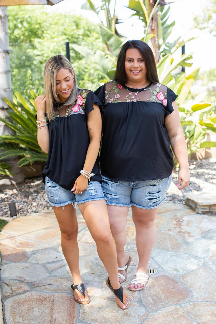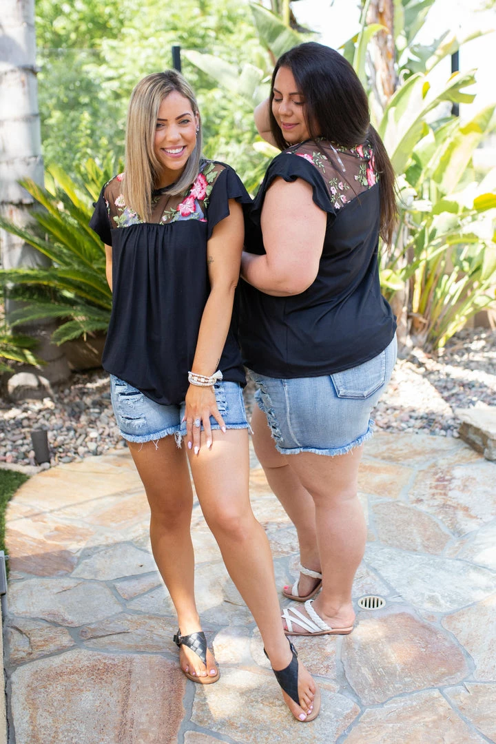 This stunning flutter sleeve top is one like no other. The floral embroidery against the mesh on the front and back will be sure to have you stand out among the rest. With a relaxed fit, this top. features short flutter sleeves and a rounded hem.